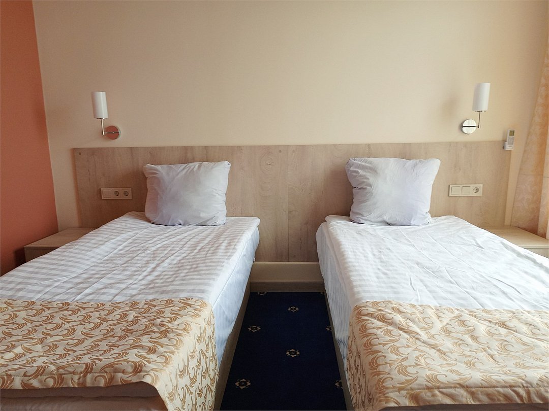 Номера категории "СТАНДАРТ. Старый номерной фонд" с 2-мя односпальными кроватями (шириной 90 см) (дата открытия 2016 год) имеют все необходимое для комфортного пребывания в отеле, а именно: телевизор, электрочайник, электрофен, столик, стулья, одежный шкаф, зеркало в полный рост, собственный санузел с душевой кабиной, зеркалом с подсветкой.Услуги и удобства