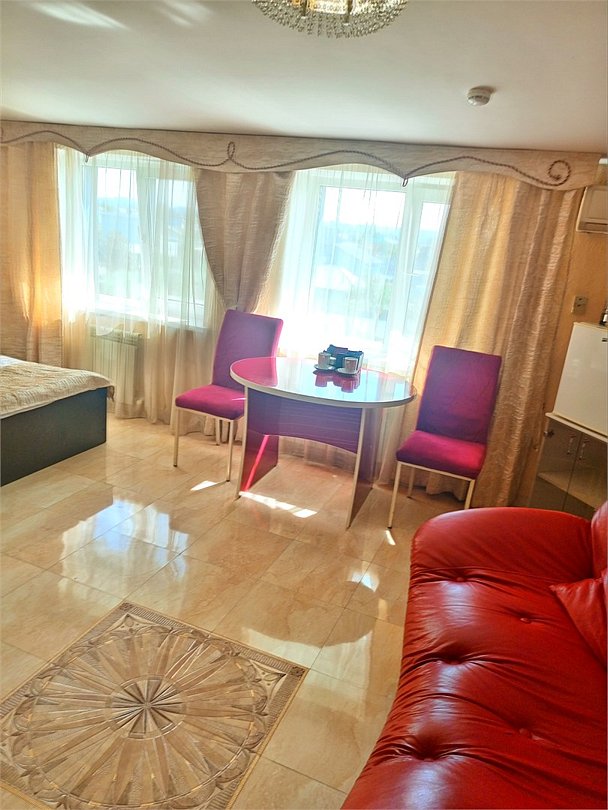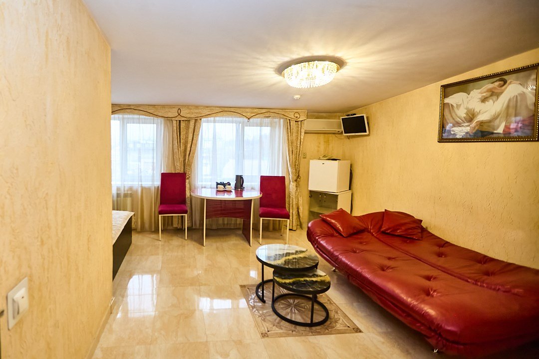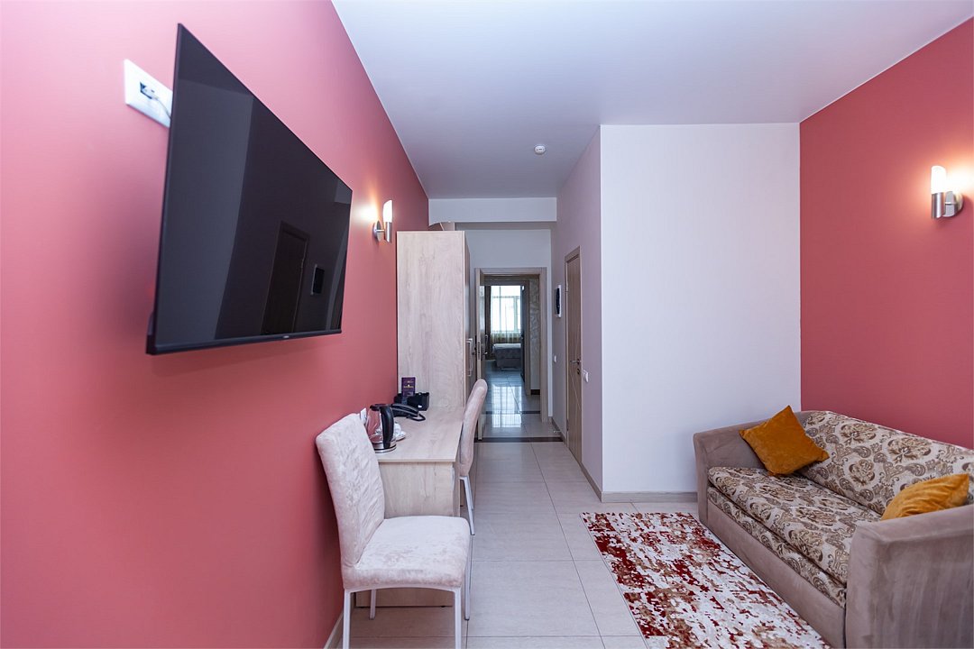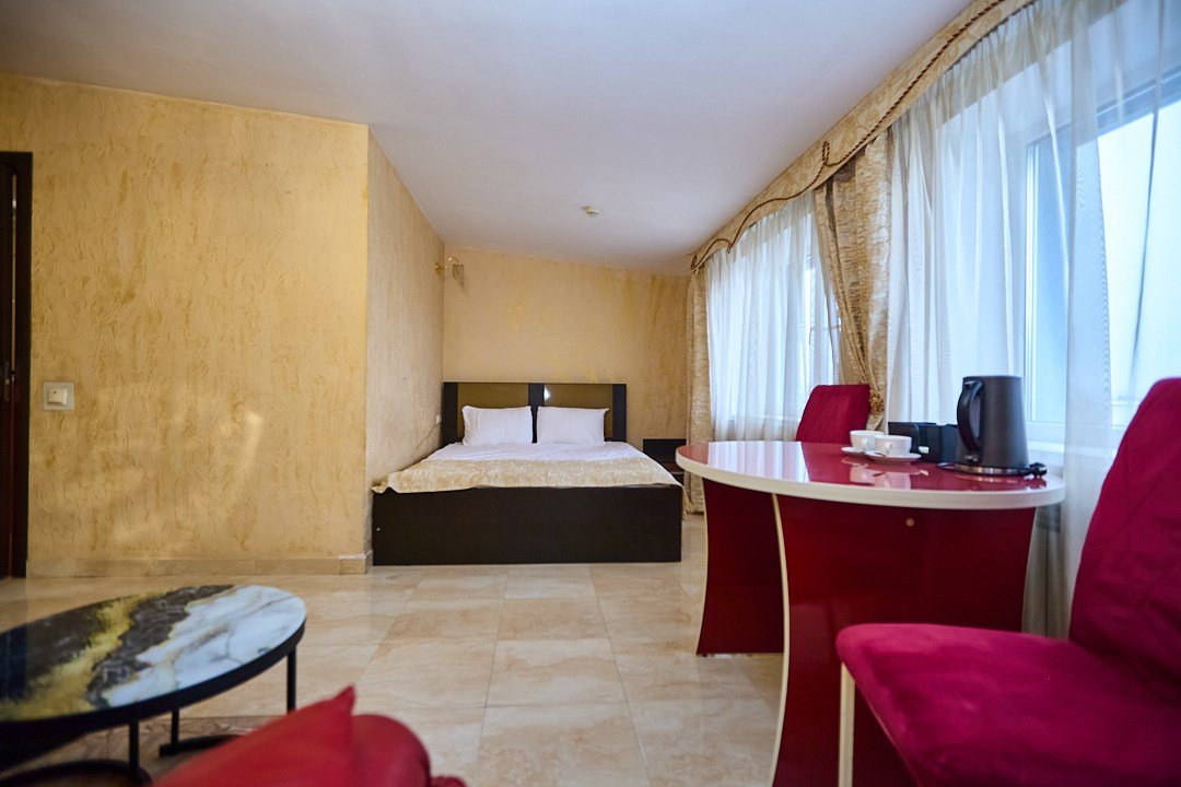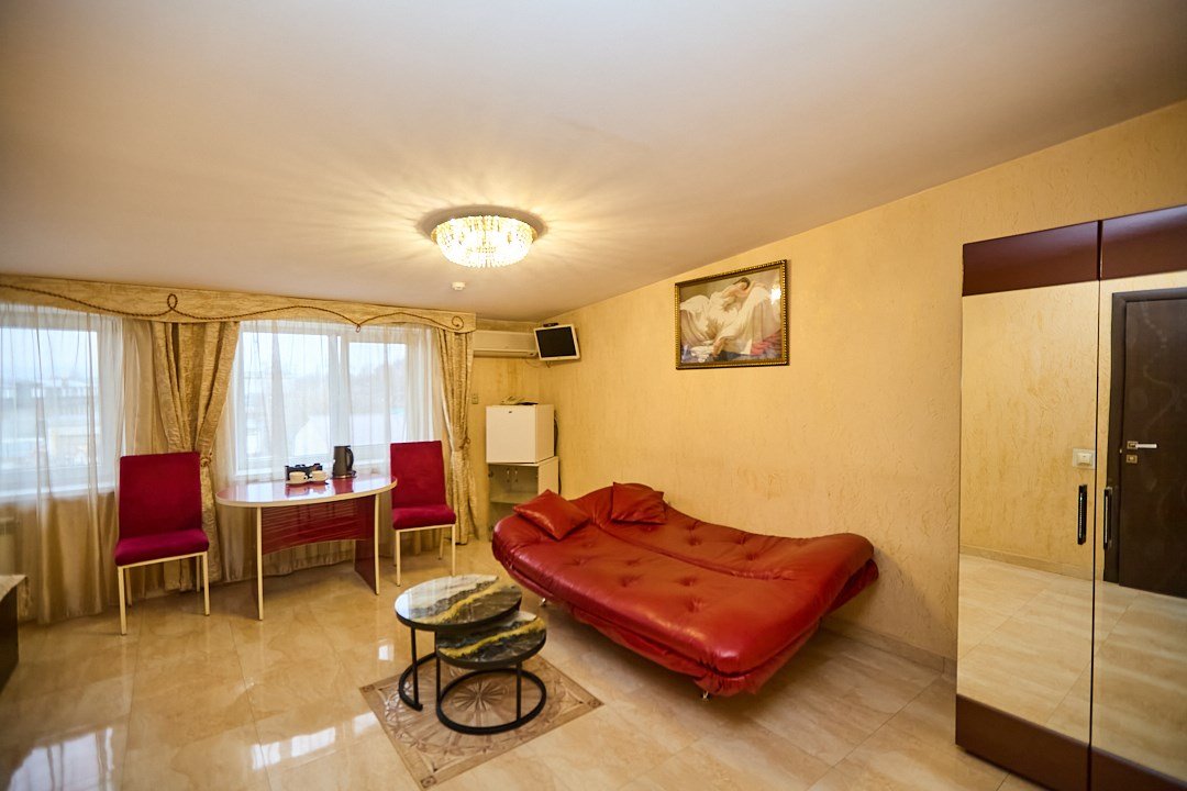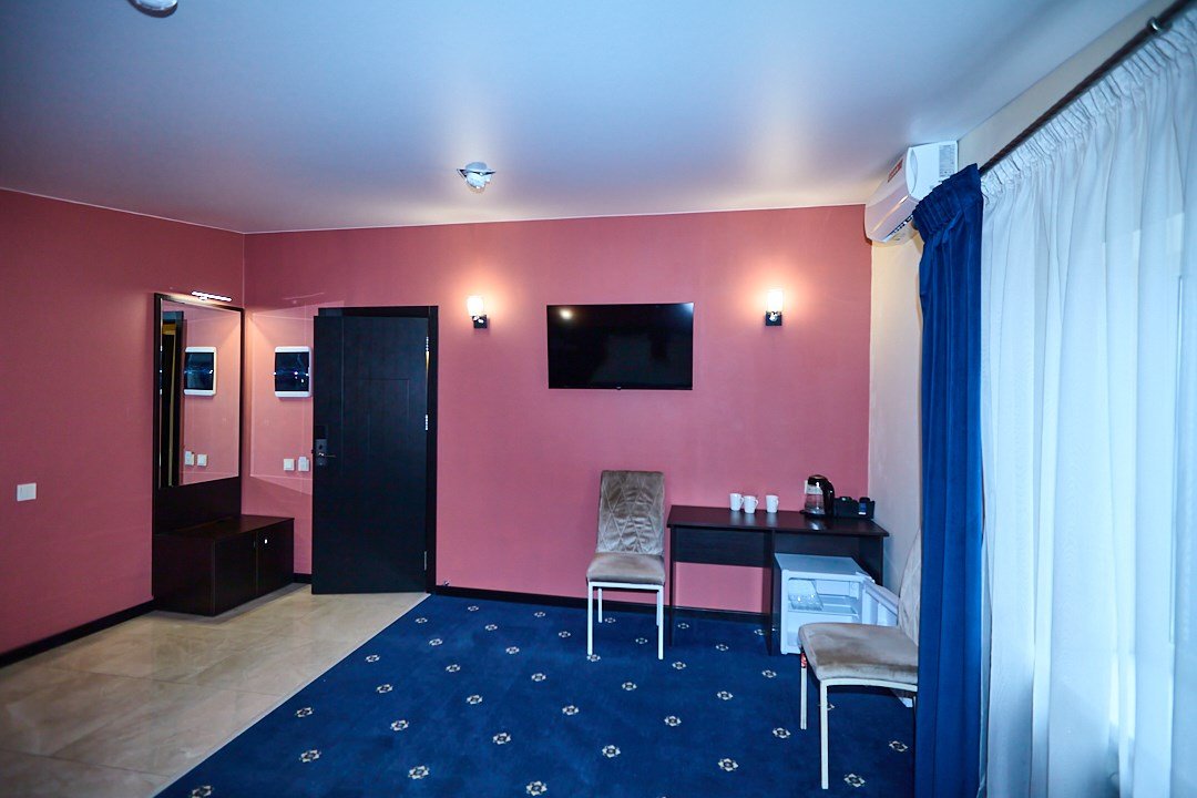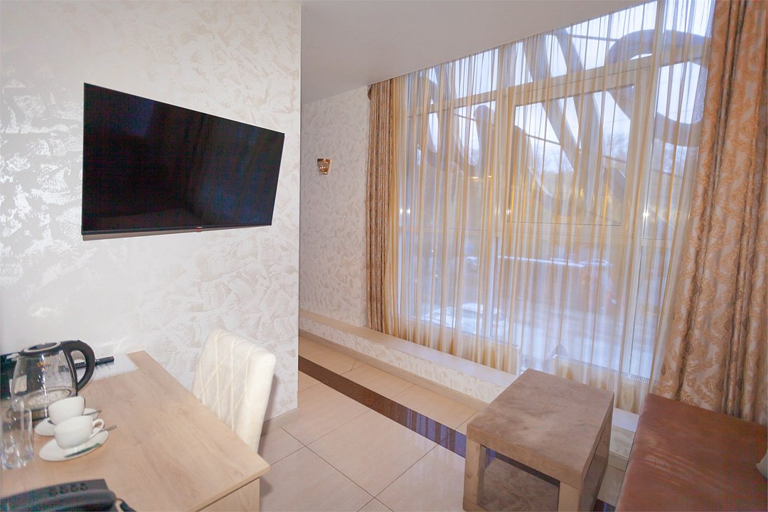 телевизор, диван, стулья, шкаф для одежды, чайный набор, чайник, душ, вид на город, стол, туалет, цифровое тв, диван-кровать, пуфикВ гостиничном номере