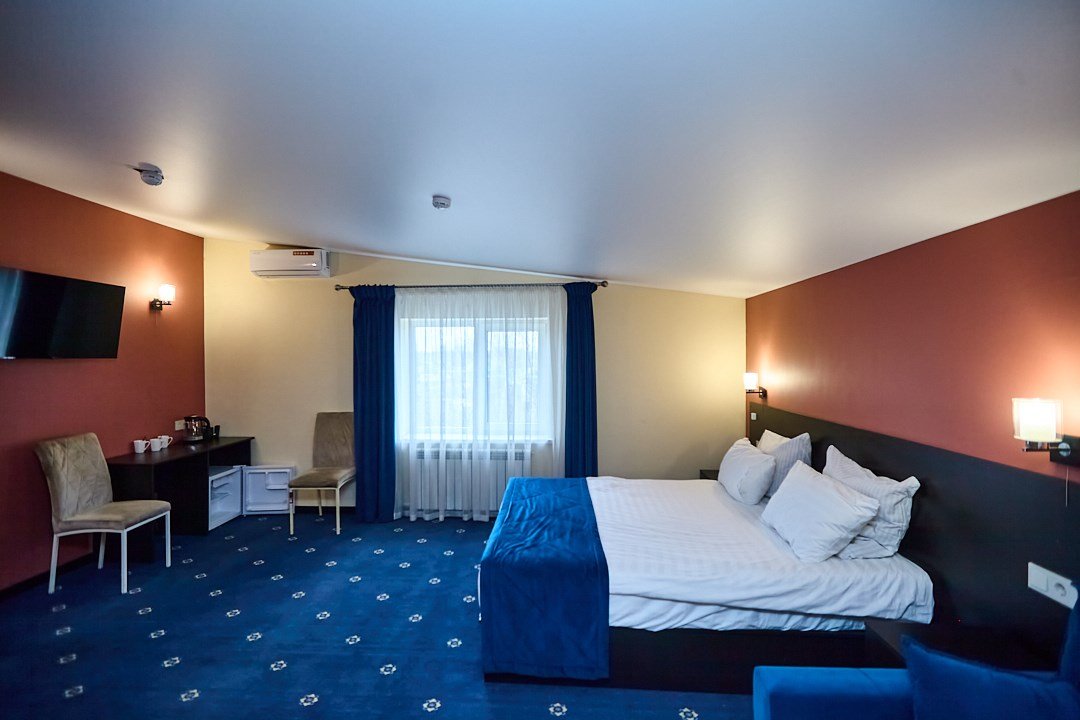 телевизор, Wi-Fi, кондиционер, фен, душевая кабина, санузел, банные полотенца, тапочки, гигиенические средства, двуспальная кровать, диван, стулья, шкаф для одежды, обеденный стол, зеркало, чайник, унитаз, душ, стаканы, стол, тумба, туалетные средства, туалет, диван-кровать, мини-холодильник, номер для некурящих, зеркало в полный ростВ гостиничном номере