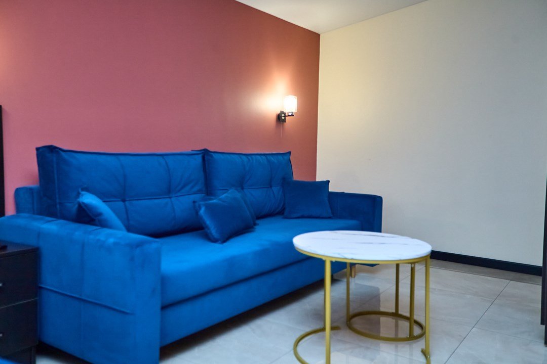 телевизор, Wi-Fi, кондиционер, фен, ванная комната, ванна, ванна или душевая кабина, санузел, банные полотенца, тапочки, двуспальная кровать, диван, шкаф для одежды, обеденный стол, зеркало, чайник, унитаз, раковина, вид на город, вид во двор, стаканы, столовые приборы, стул, стол, тумба, туалет, мини-холодильник, зеркало в полный ростВ гостиничном номере
