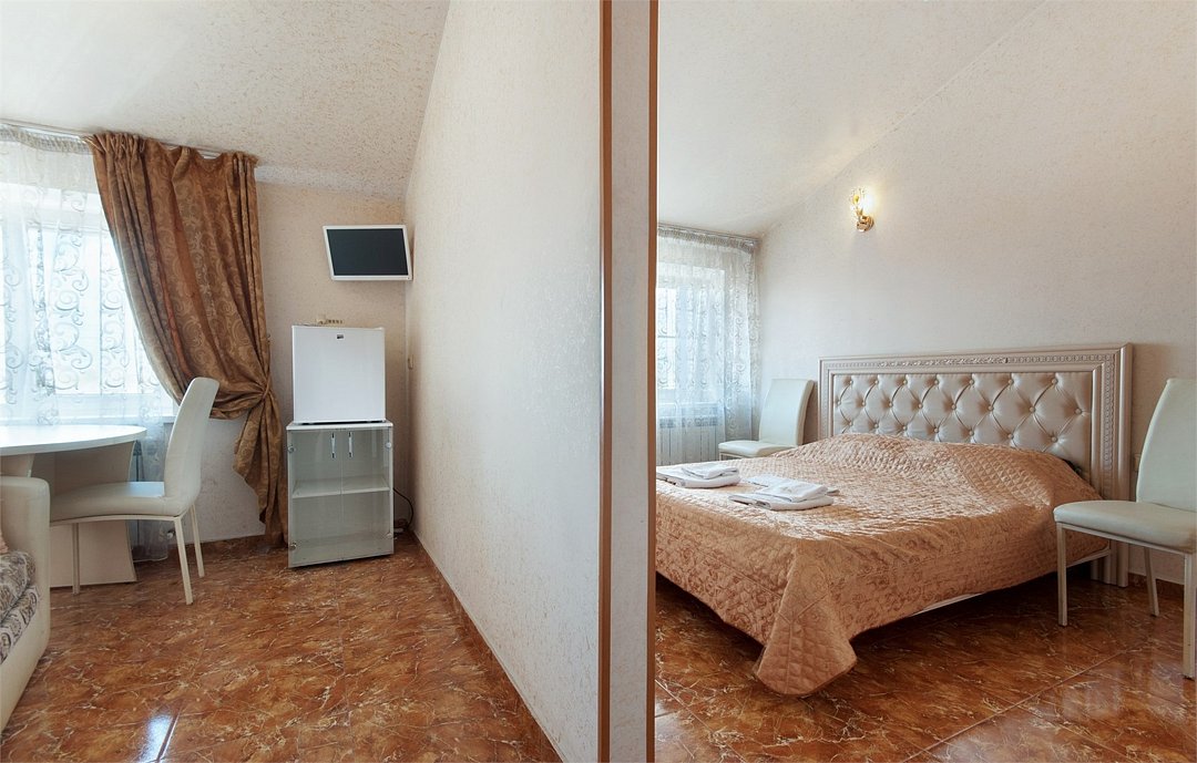 2-х комнатный, просторный номер, оформленный в светлых тонах, расположен в старом номерном фонде, на 3 этаже нашего здания. В номере есть вся необходимая мебель для комфортного размещения. Также есть телевизор и мини-холодильник. Большая 2-спальная кровать и 1,5-спальная кровать, на которой возможно размещение 1 взрослого человека или 2-х детей.Услуги и удобства