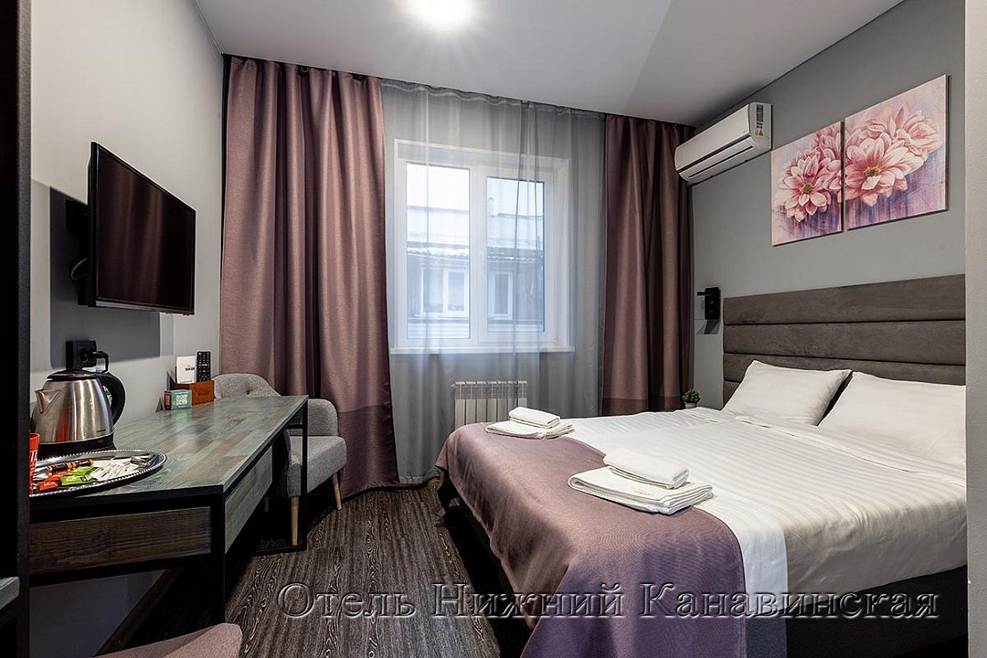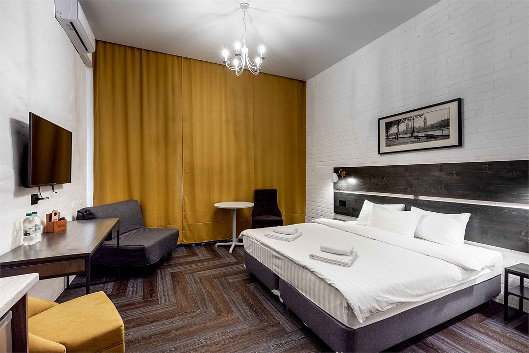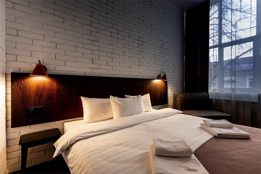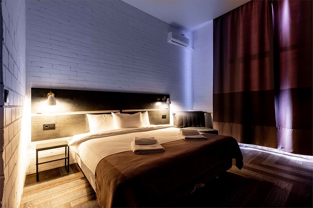 Категория номера «КРЕПКИЙ СОН» Удобная кровать, рабочая зона, в номере уже есть все необходимое, что позволит вам сполна восстановить силы после насыщенного дня, а расположение номера на тихую сторону сделать ваш сон максимально крепким. В вашем распоряжении будет: • Двуспальная кровать king-size / две раздельные полутороспальные кровати (на ваш выбор); •Окна номера расположены в тихий дворик; •Этаж: 1/2 •Кондиционер •Цифровое TV 20 каналов, Smart-TV; •Высокоскоростной бесплатный Wi-Fi; •Холодильник; •Телевизор с диагональю 43"; •Гигиенические принадлежности; •Гипоаллергенное постельное белье и подушки; •Полноценная ванная комната внутри номера; •Чайные принадлежности; •Фен и тд.Услуги и удобства