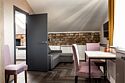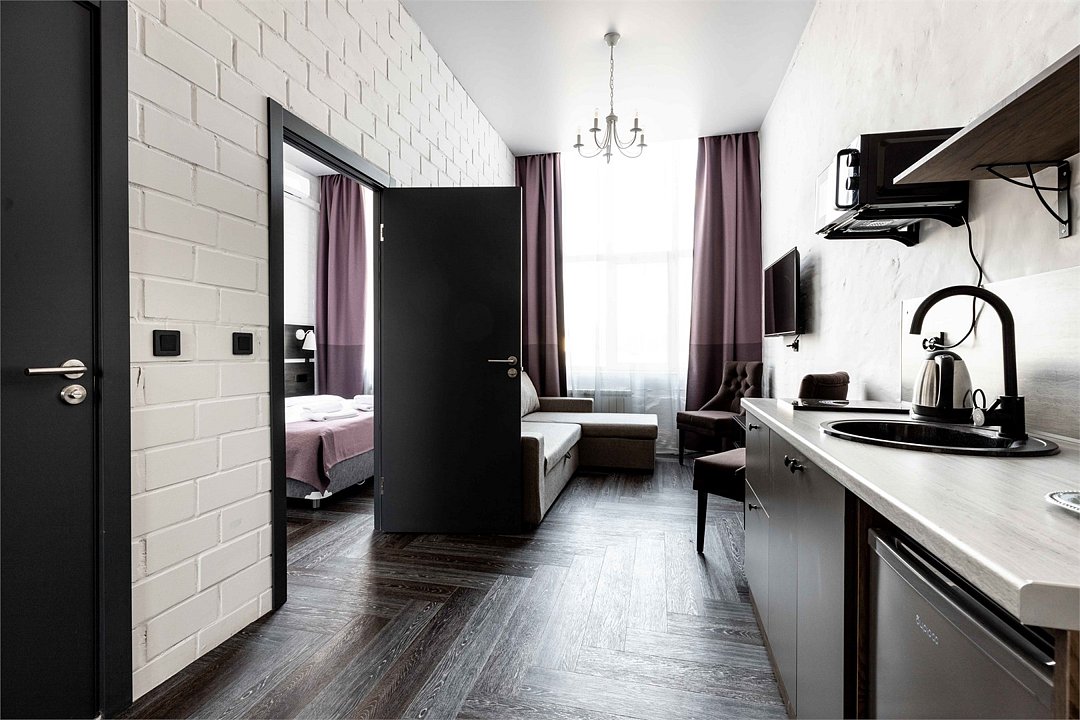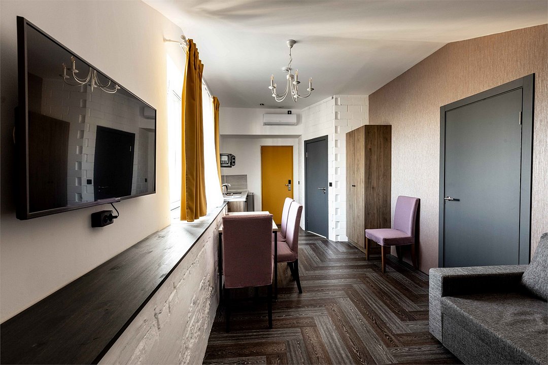 Категория номера «АПАРТАМЕНТЫ» Комфортный и просторный двухкомнатный номер с мини-кухней, который подойдет как для семейных поездок, так и для любителей больших пространств. В одной из комнат есть зона отдыха с раскладным диваном и обеденным столом. В номерном фонде представлены: • Двуспальная кровать king-size / две раздельные полутороспальные кровати (на ваш выбор), дополнены угловым двуспальным диваном; • 1-комнатные/2-х комнатные •Окна с видом на город; •Этаж: 1/2/3 (3 этаж - мансарда); • Оборудованная мини-кухня со всем необходимым инвентарем; •Микроволновая печь; •Индукционная плита; •Кондиционер •Цифровое TV 20 каналов, Smart-TV; •Высокоскоростной бесплатный Wi-Fi; •Холодильник; •Телевизор с диагональю 43"; •Гигиенические принадлежности; •Гипоаллергенное постельное белье и подушки; •Полноценная ванная комната внутри номера (ванна); •Чайные принадлежности; •Фен и тд.Услуги и удобства