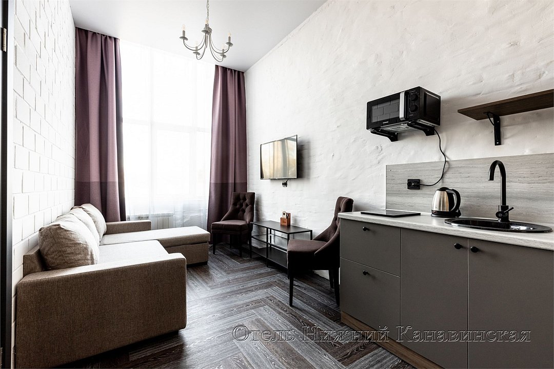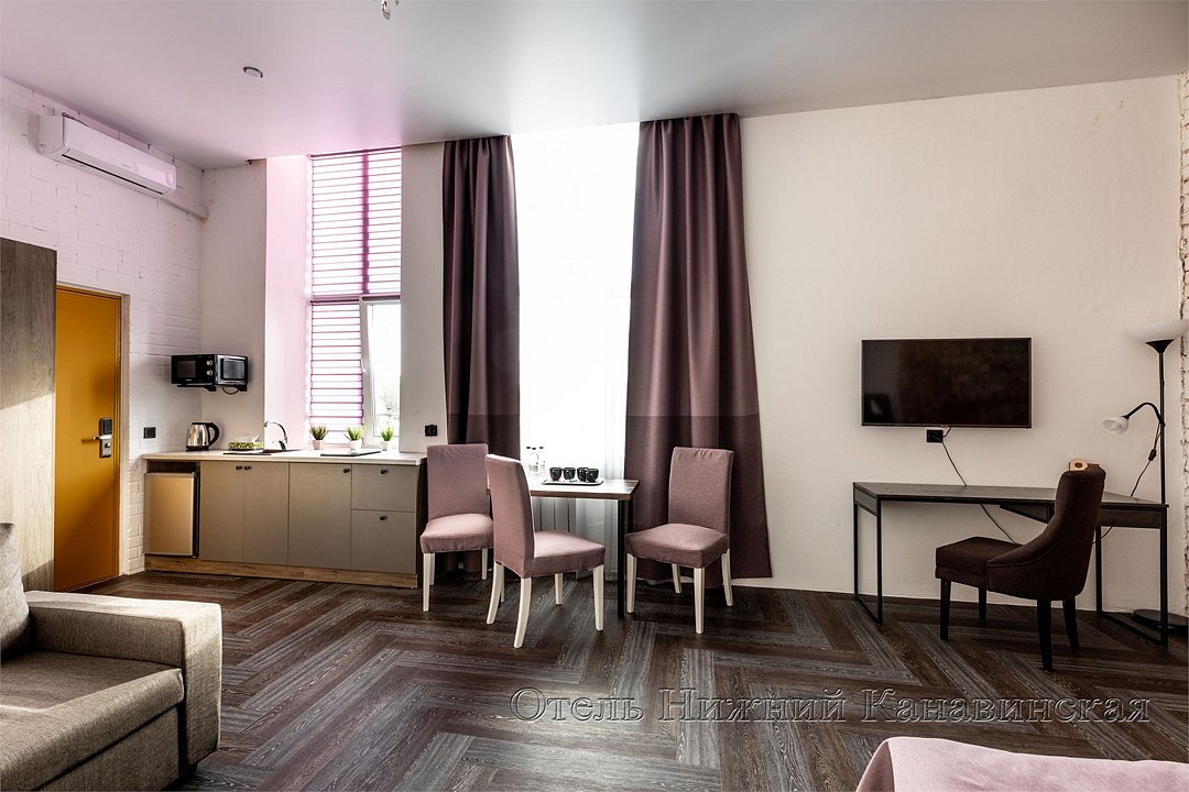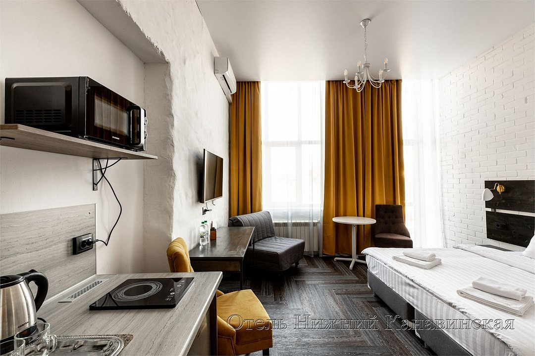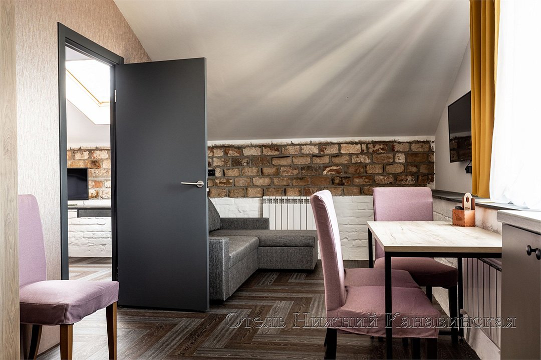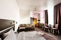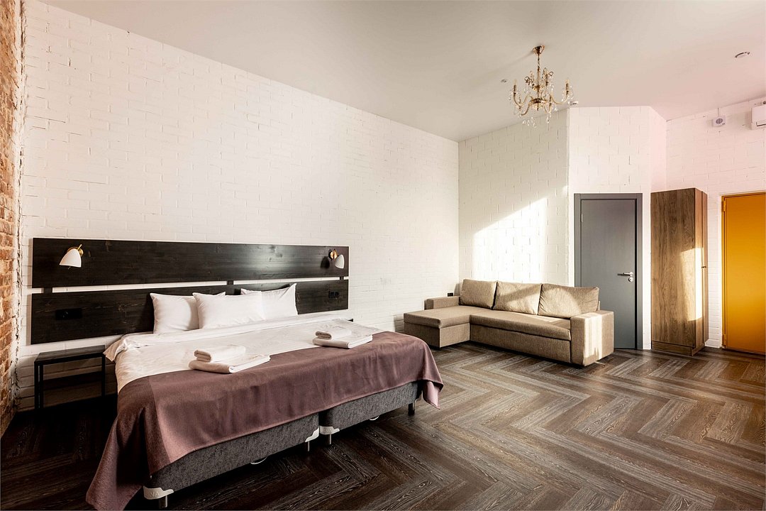 Категория номера «Люкс» Комфортный и просторный двухкомнатный номер с мини-кухней, номер, который подойдет как для поездок семьей, так и для компании друзей. В одной из комнат есть зона отдыха с раскладным диваном и обеденным столом. В вашем распоряжении будет: -Двуспальная кровать king-size / две раздельные полутороспальные кровати (на ваш выбор), дополнены угловым двуспальным диваном; -2-х комнатный номер -Окна в тихий двор; -Этаж: 1/2/3 (3 этаж - мансарда); -Оборудованная мини-кухня со всем необходимым инвентарем; -Микроволновая печь; -Индукционная плита; -Кондиционер -Цифровое TV 20 каналов, Smart-TV; -Высокоскоростной бесплатный Wi-Fi; -Холодильник; -Телевизор с диагональю 43"; -Гигиенические принадлежности; -Гипоаллергенное постельное белье и подушки; -Полноценная ванная комната внутри номера (ванна); -Чайные принадлежности; -Фен и тдУслуги и удобства