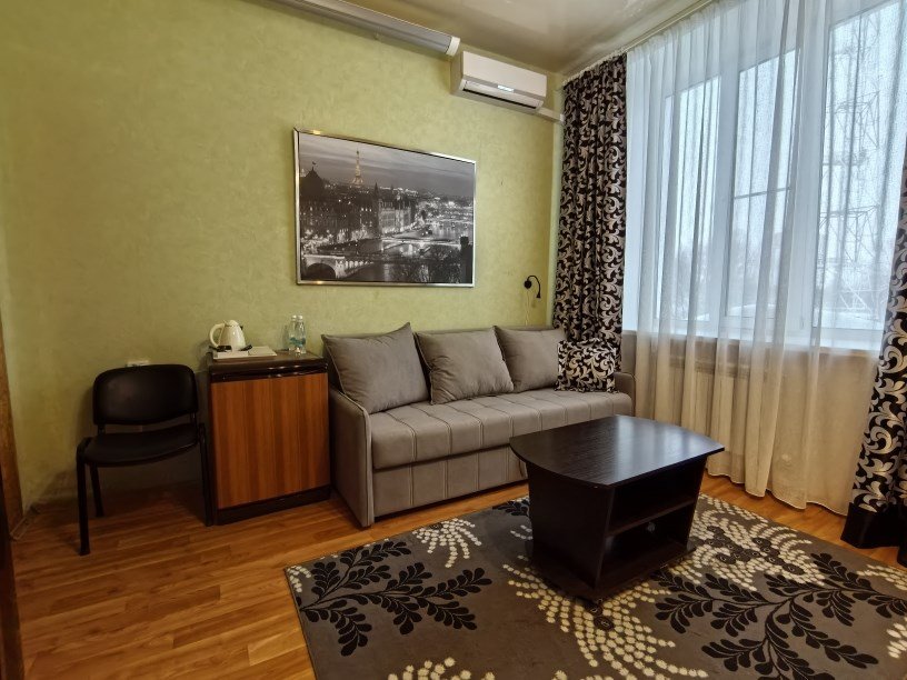 Wi-Fi, телефон, холодильник, кондиционер, светильник, настольные лампы, фен, ванная комната, ванна, санузел, банные полотенца, гигиенические средства, полутораспальная кровать, диван, тумбы, стулья, шкаф для одежды, вешалки, журнальный столик, ковер, мебельный гарнитур, набор посуды, обслуживание номеров, чайник, унитаз, раковина, отопление, отдельный вход в номер, кулер на этаже, диван-кровать, телевизор с плоским экраномВ гостиничном номере