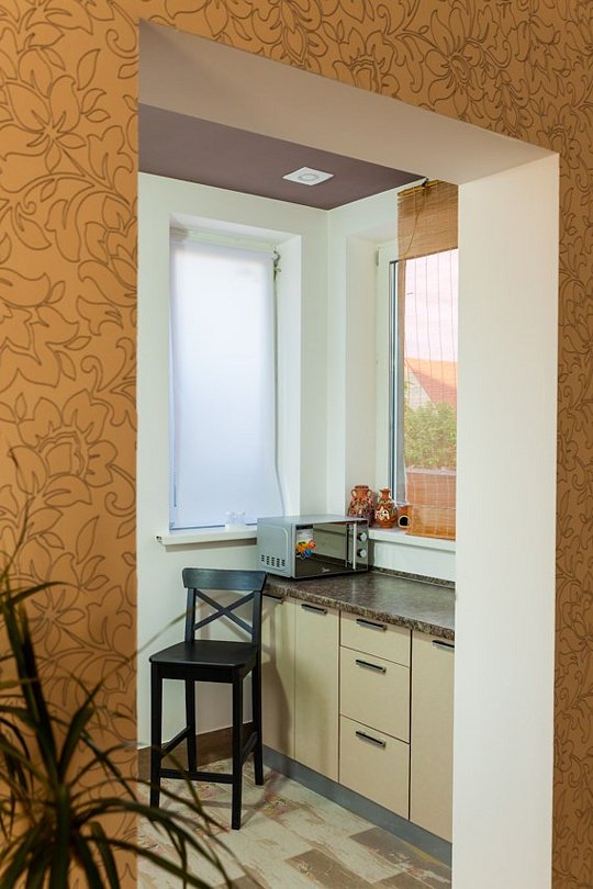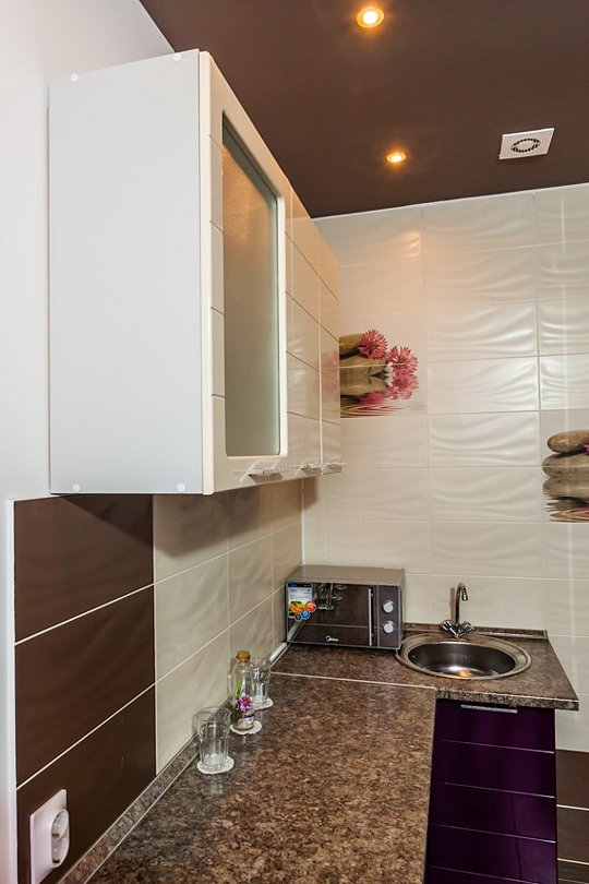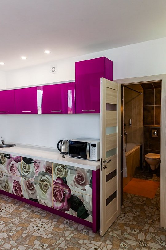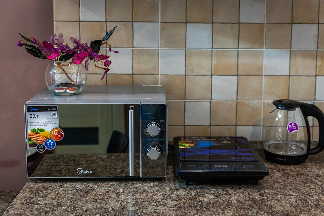 Кухня, санузел с душевой. Тапочки, ванно-туалетные средства. Все средства для приготовления и употребления пищи. Чайник , микроволновка , холодильник.Услуги и удобства