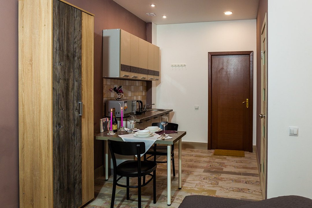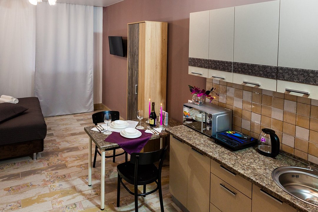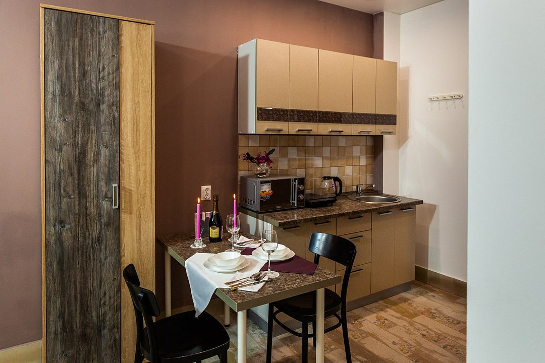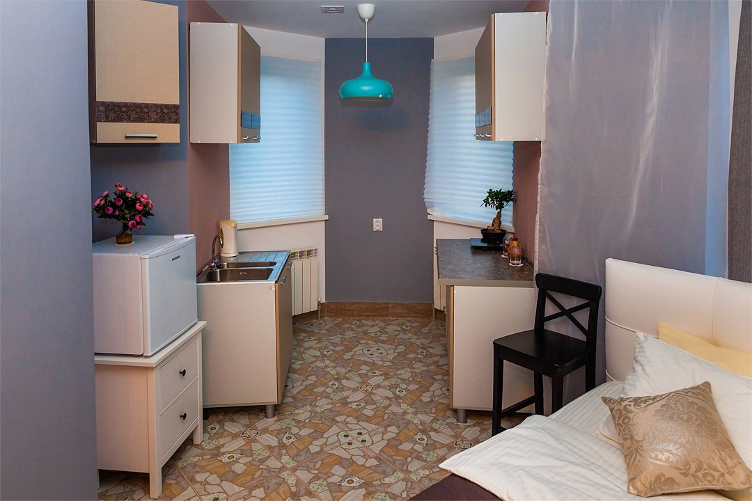 Кухня, санузел с душевой, столовые приборы т все для приготовления и употребления пищи.Тапочки и ванно-туалетные принадлежности.Услуги и удобства
