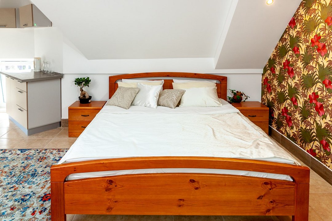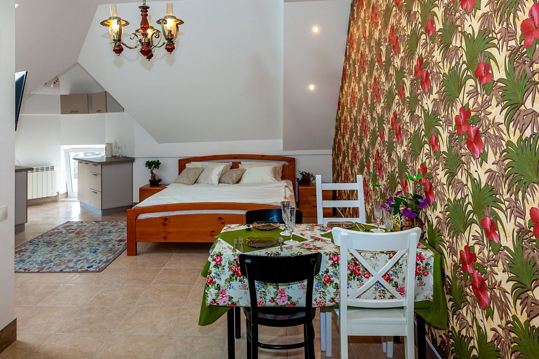 Две комнаты с двумя кроватями кинг-сайз.Кухня, санузел с душевой. Тапочки, ванно-туалетные средства. Все средства для приготовления и употребления пищи. Чайник , микроволновка , холодильник.Услуги и удобства