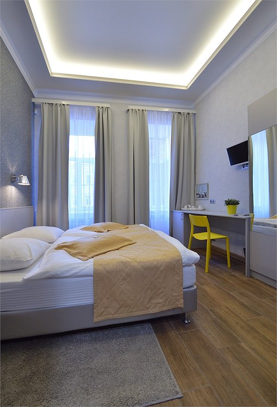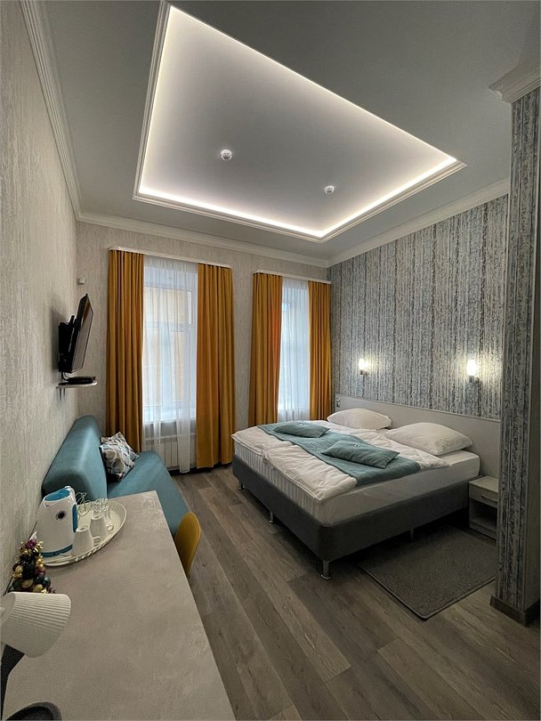 Улучшенный стандартный номер с высокими потолками, окна выходят на улицу Рождественская. Номер оборудован двумя односпальными кроватями или двухспальной кроватью + диван-кровать с двумя дополнительными местами. Размещение до 4 человек. Возможно проживание с детьми старше 12 лет.Услуги и удобства
