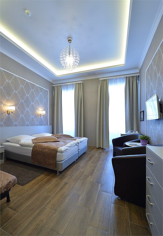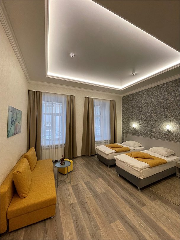 Просторный семейный номер с высокими потолками и современным интерьером оборудован кондиционером и мини-холодильником, ванной комнатой с душем и туалетными принадлежностями. Окна выходят на ул.Рождественская. Здесь могут остановиться не только гости в количестве трех человек, но и семейная пара с одним или двумя детьми старше 12 лет.Услуги и удобства