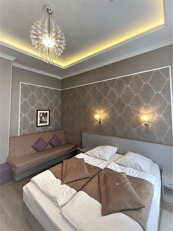Улучшенный стандартный номер с двухспальной кроватью "king-size" + диван-кровать с двумя дополнительными местами. Тихий, уютный номер с окнами выходящими во двор оборудован кондиционером, сейфом, спутниковым TV и бесплатным WI-FI. Размещение с детьми возможно с 12 лет.Услуги и удобства