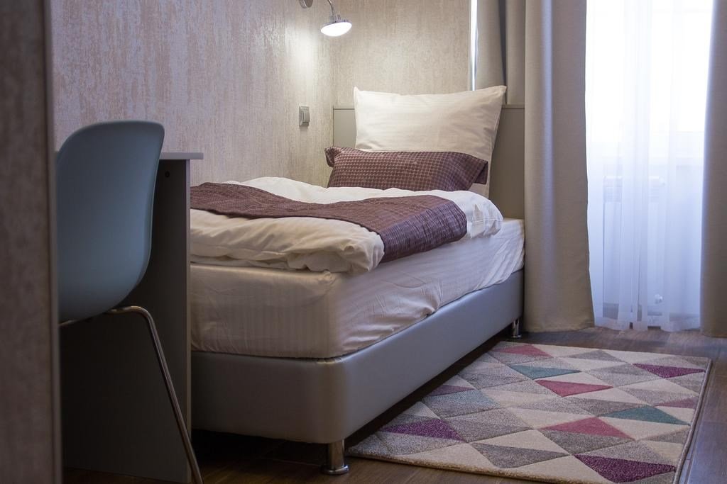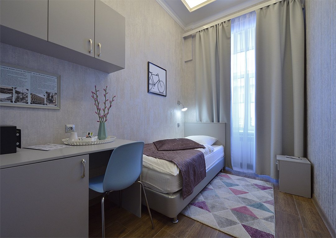 Уютный небольшой номер для оптимального и комфортного размещения 1 гостя. В номере стандартная кровать с удобным ортопедическим матрацем, рабочий стол и холодильник. В номере душевая кабина и необходимые косметические принадлежности.Услуги и удобства