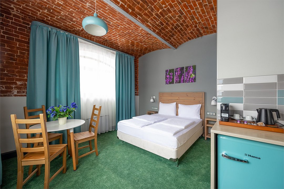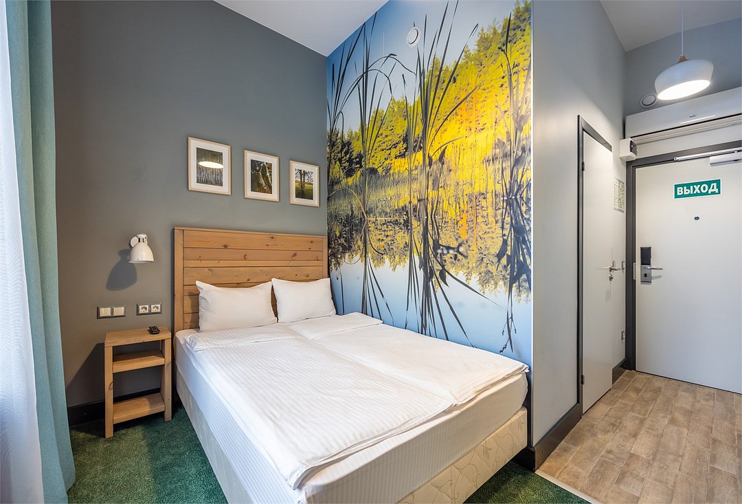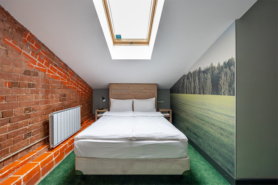 Номер с одной двуспальной кроватью без собственного санузла. Наш современный Отель оборудован комфортными пространствами для общего пользования. В распоряжении гостей: душевые и туалетные комнаты, кухня и прачечная. Имеются номера с мансардным окном.Услуги и удобства