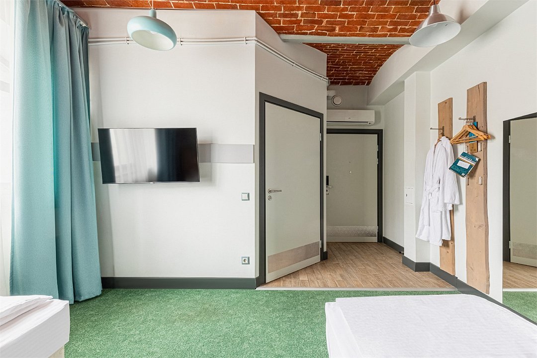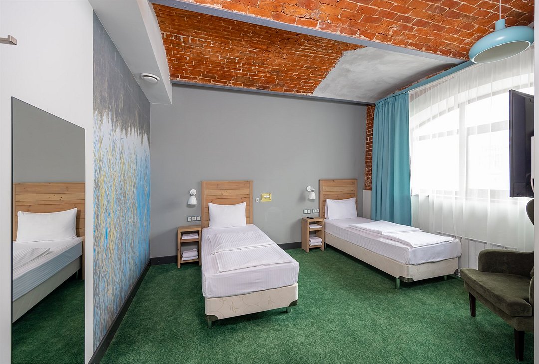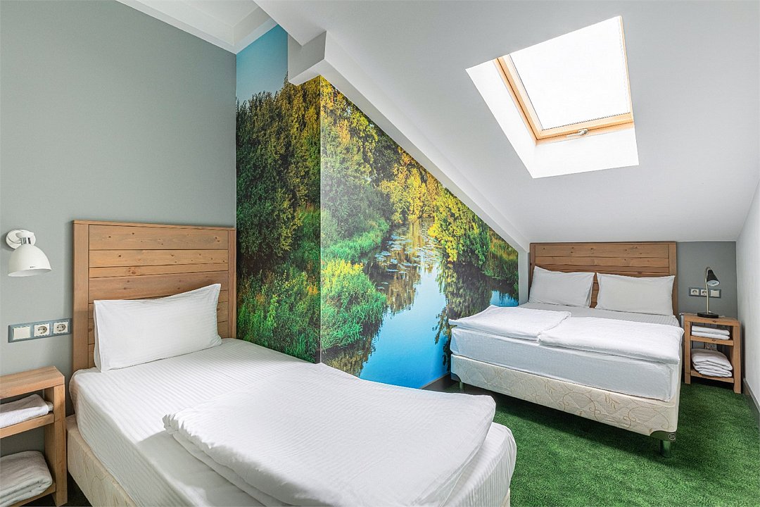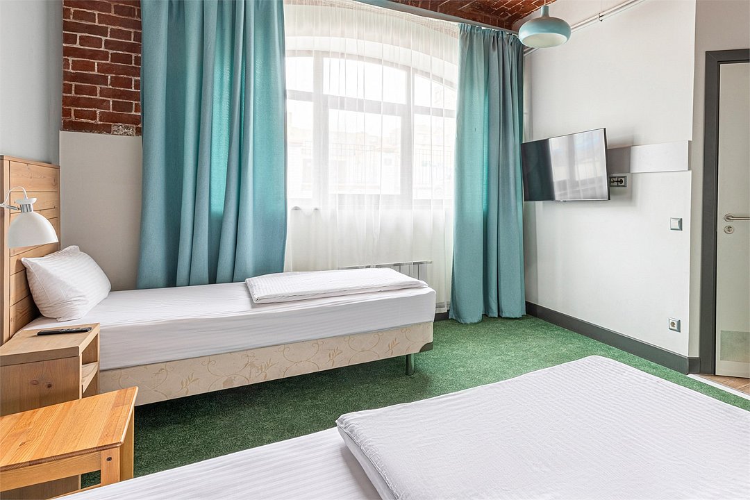 Номер с одной двухместной и одной отдельной кроватями. Наш современный Отель оборудован комфортными пространствами для общего пользования. В распоряжении гостей: душевые и туалетные комнаты, кухня и прачечная. Имеются номера с мансардным окном.Услуги и удобства