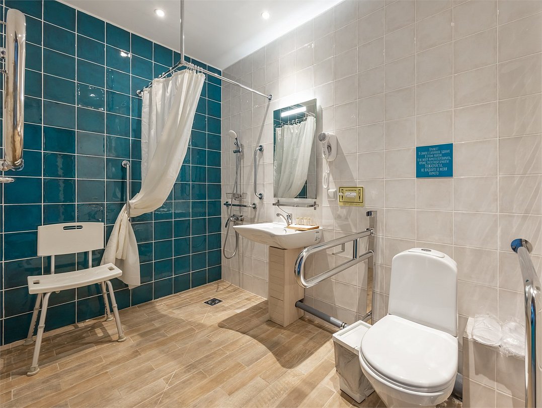 Номер специально оборудован для пребывания гостя с ограниченными возможностями. Удобное расположение позволяет без помех передвигаться до кафе и Лобби отеля. Кафе отеля так же оборудовано специальной туалетной комнатой.Услуги и удобства