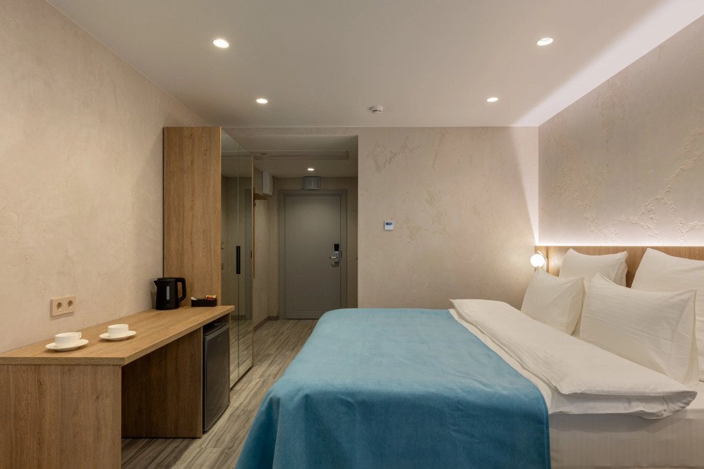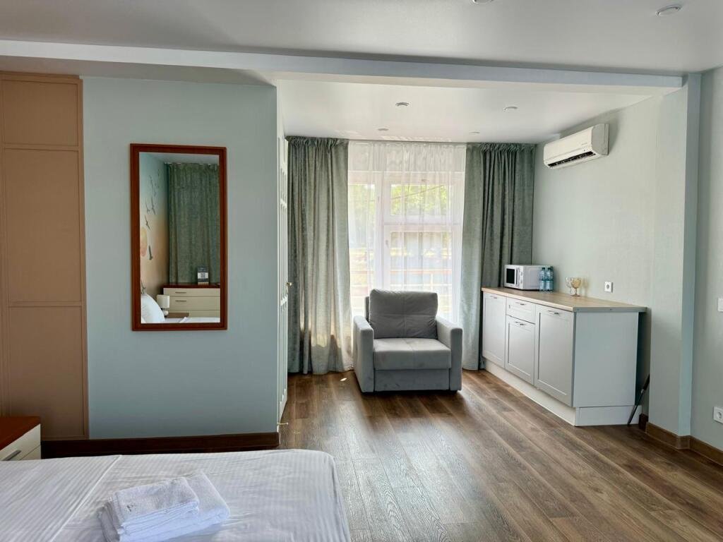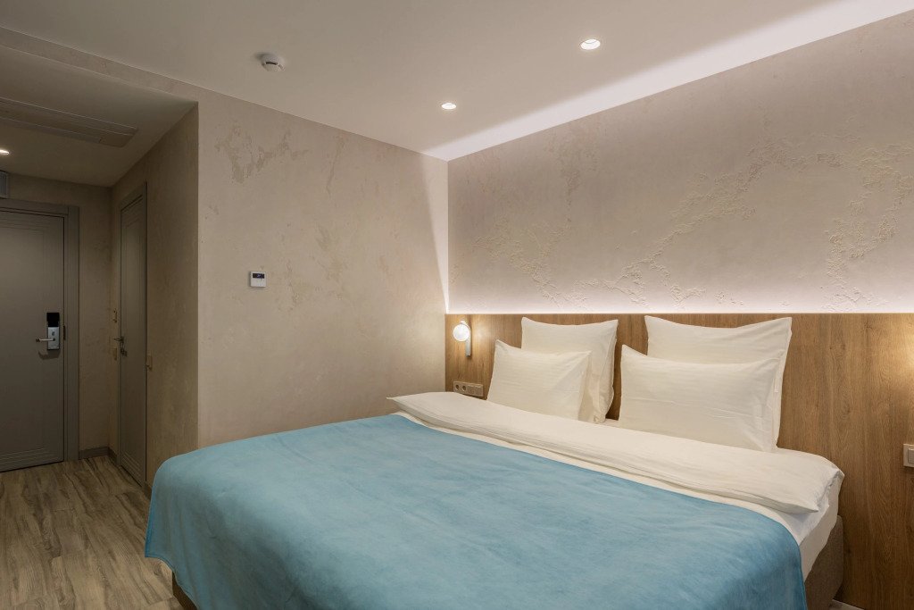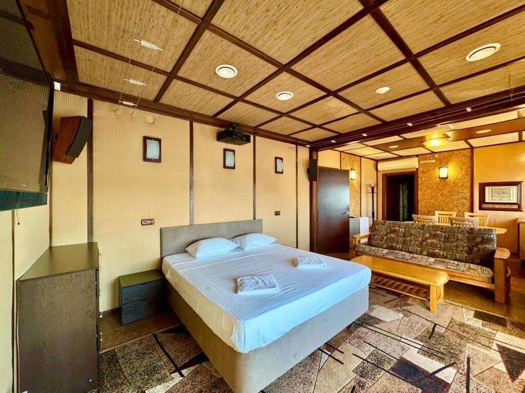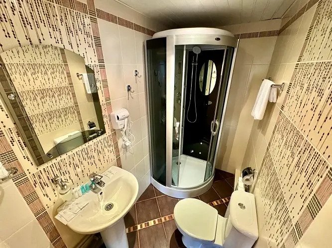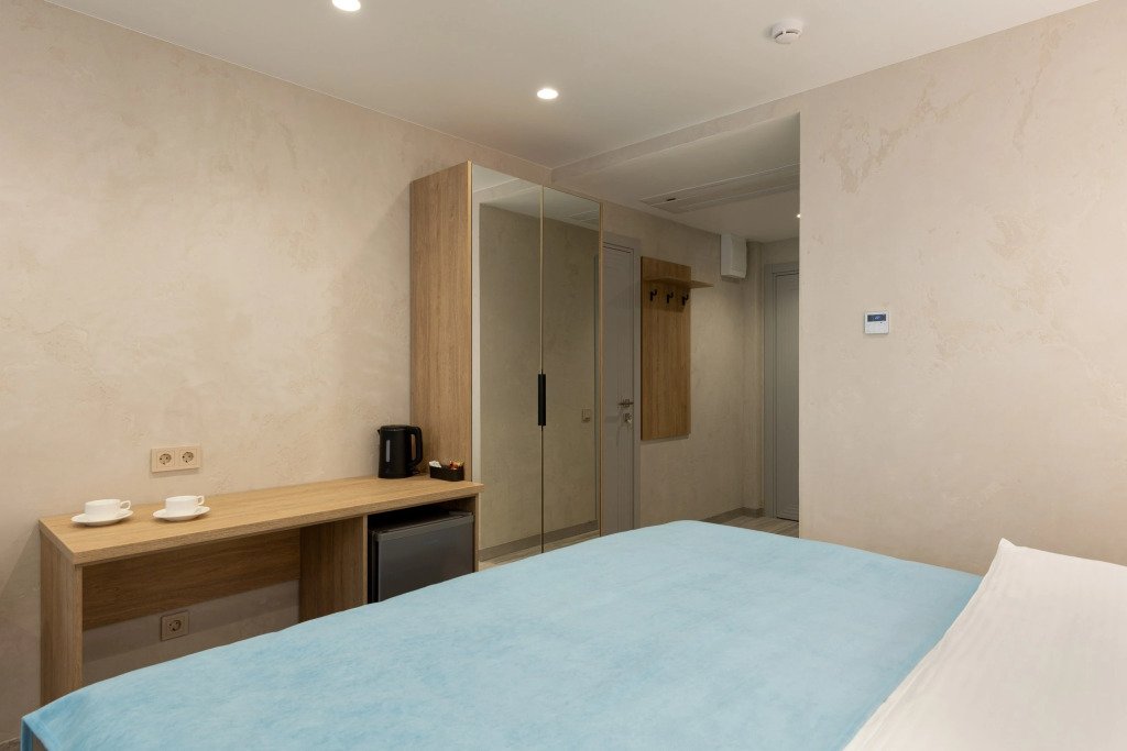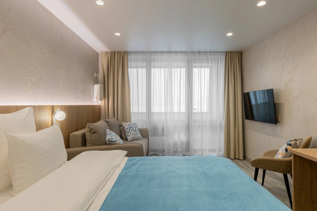 Номер уютно обставлен и оснащён необходимым, чтобы отдохнуть после долгого и насыщенного дня. Имеются телевизор и халат. Перечисленные услуги есть не во всех номерах.