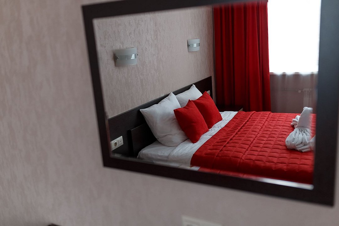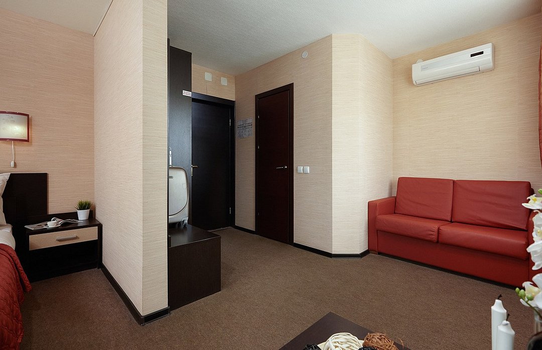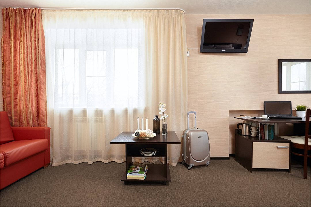 Современные однокомнатные номера с евроремонтом, соответствующие европейским стандартам. Включают в себя все необходимое для полноценного отдыха: большая кровать, диван(не во всех номерах), кондиционер, шкаф для одежды, ЖК телевизор, wi-fi, удобное рабочее место, холодильник, телефон, душевая кабина, банные полотенца, душевые принадлежности, фен, чайник.Услуги и удобства