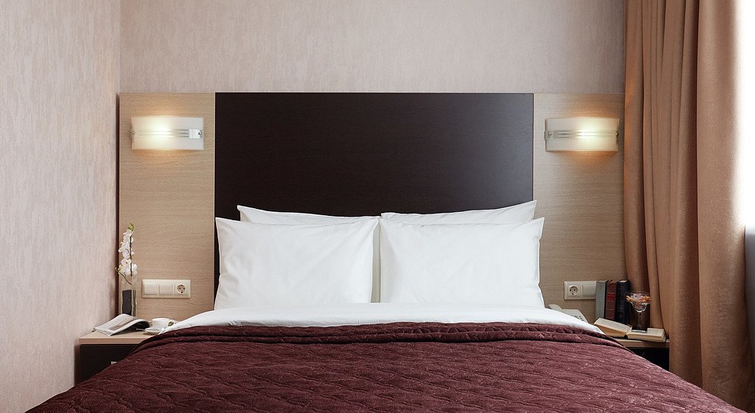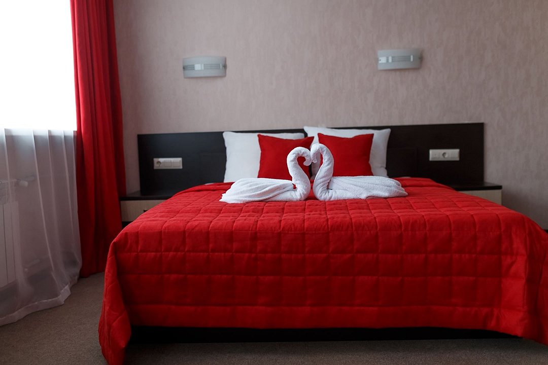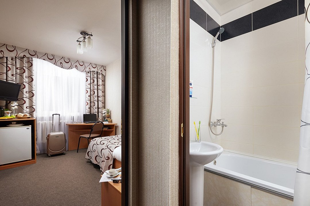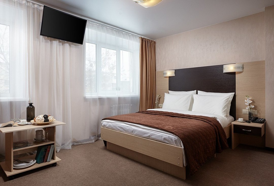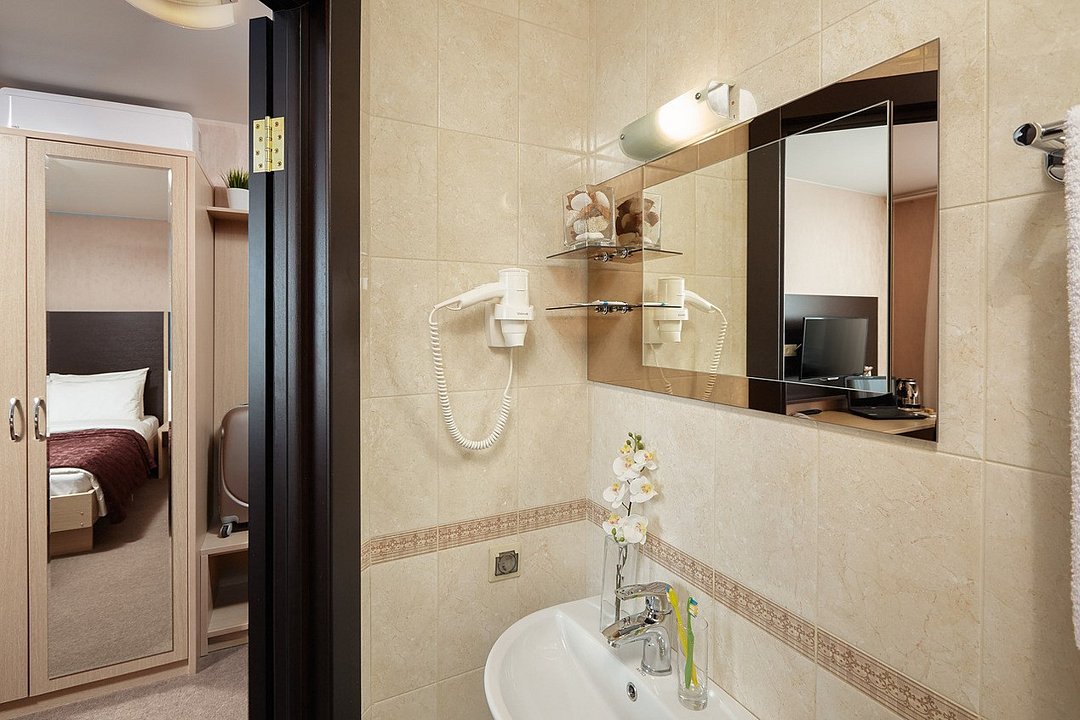 Уютные номера категории "Стандарт" оснащены всем необходимым. Возможно одно- и двухместное размещение в номерах. В номере: две односпальные кровати или одна большая, кондиционер, встроенный шкаф для одежды, телевизор, wi-fi, холодильник, телефон с выходом в город, ванная комната, банные полотенца, душевые принадлежности.Услуги и удобства