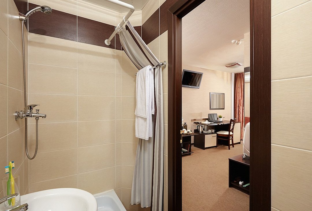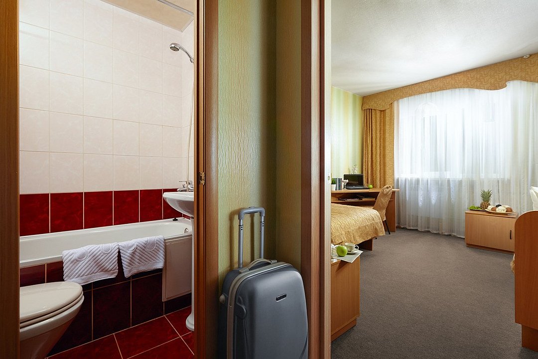 В номере есть все необходимое для комфортного отдыха: 2 раздельные кровати, плазменный телевизор, кондиционер, шкаф для одежды, удобное рабочее место, холодильник, телефон, банные полотенца, душевые принадлежности, тапочки, минеральная вода, фен, чайник.Услуги и удобства