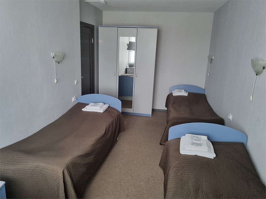 Уютные номер категории "Стандарт Совмещенный" оснащены всем необходимым. Возможно трехместное, четырехместное и пятиместное размещение в номерах. На два уютных номера с двух- и трехместным размещением одна туалетная комната с душевой кабиной. В каждой комнате: 1,5 спальные кровати, шкаф для одежды, рабочий стол, телевизор, wi-fi, холодильник, телефон с выходом в город. Одна душевая кабина на две команты, банные полотенца, душевые принадлежности.Услуги и удобства