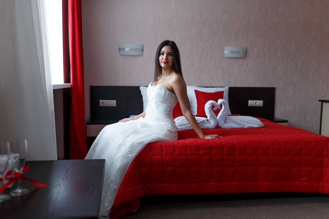 Стильный интерьер и классический дизайн. Пространство номера оформлено с легкими нотками романтики в декоре. Сердцем интерьера студии является большая и просторная кровать. Стоимость номера для молодоженов в Нижнем Новгороде также включает комплекс сопутствующих услуг: завтрак на 2 персоны, кабельное TV, подключение к сети Wi-Fi, принадлежности для личной гигиены в ванной. Проведение банкета оплачивается отдельно.Услуги и удобства