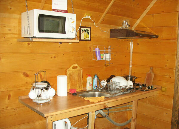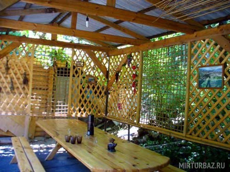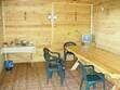 На участке есть две крытые площадки с большими столами для проведения однодневных праздничных вечеринок. Все пристройки и приспособления также, как и дома, полностью сделаны из дерева, обработанного старинным способом - под скобель (с бревна сдирается слой коры, при этом дерево сохраняет свою наружную структуру и приобретает характерный восковой блеск).