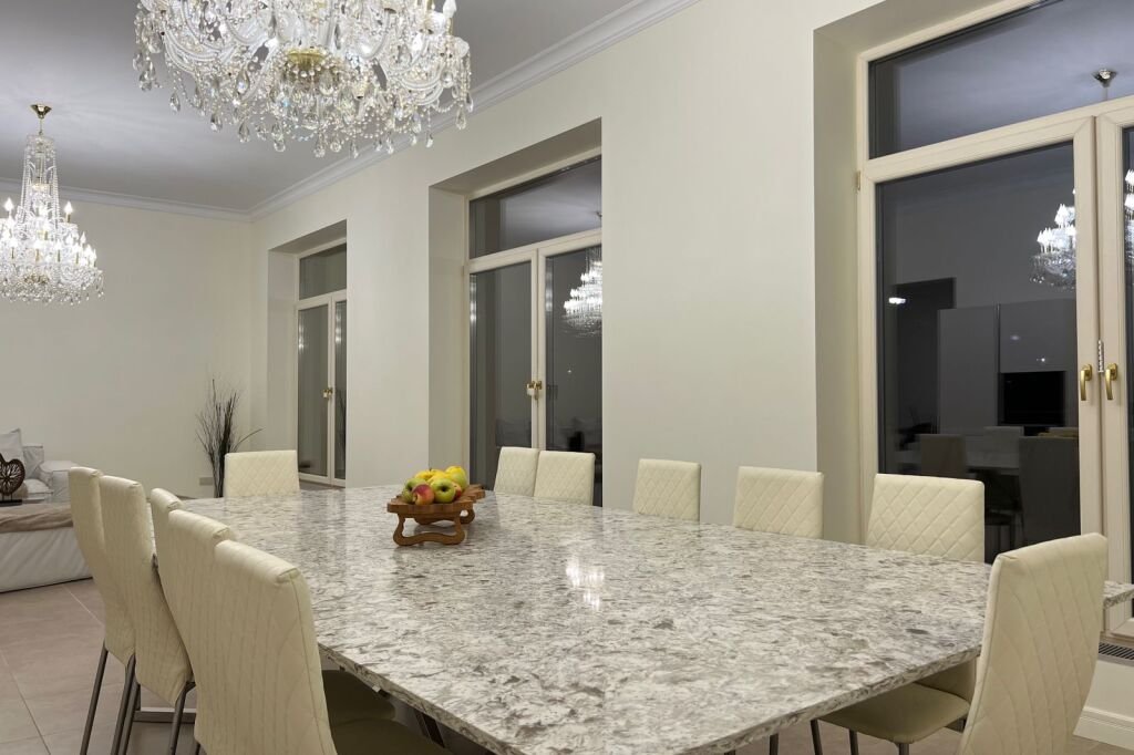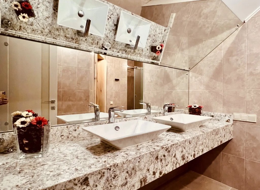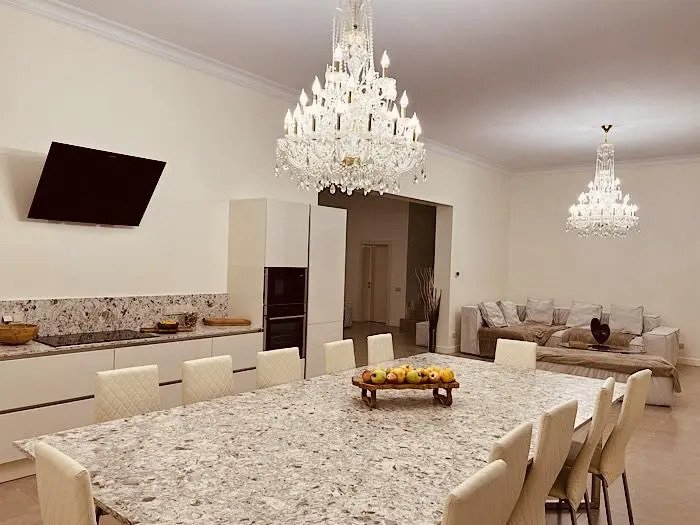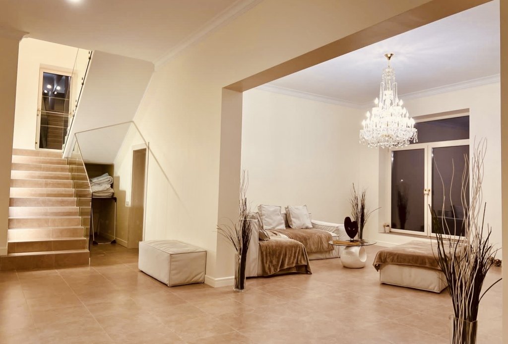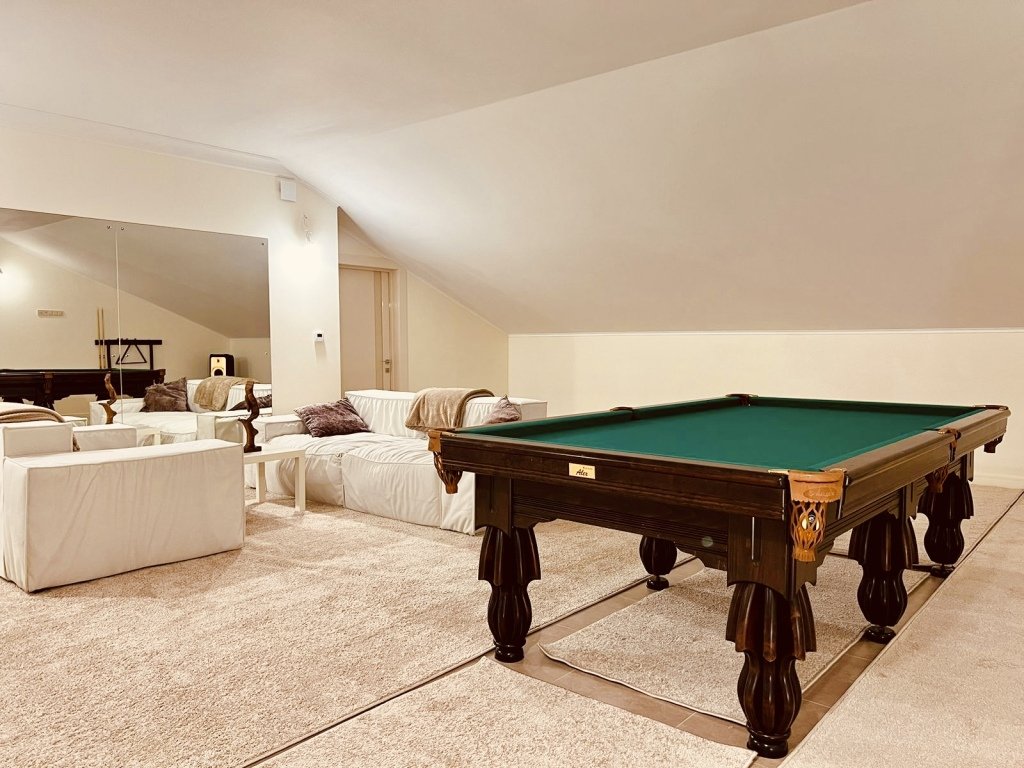 Коттедж состоит и 2 этажей, 440 кв. м. 1 этаж: кухня-гостиная с установленной техникой, столешница керамогранит, полы с подогревом. 3 спальни, 2 уборные, фильтрованная вода из крана. 2 этаж: 3 спальни, кедрово-соляная сауна, кинозал, бильярдный зал, 1 уборная.