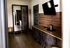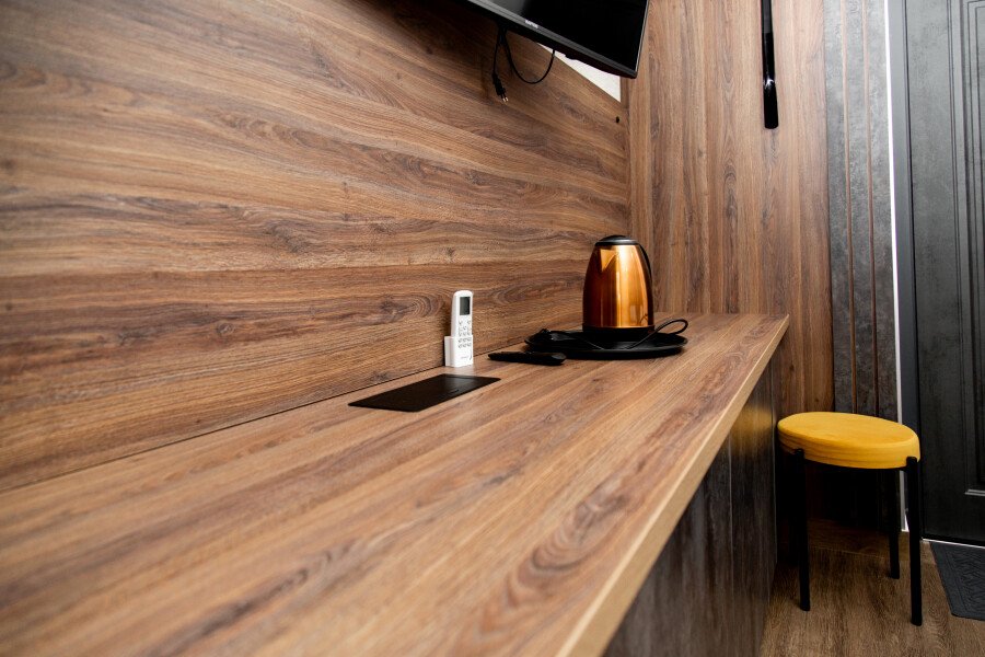 Номер оборудован двуспальной кроватью (сто восемьдесят сантиметров) плюс односпальной кроватью (девяносто сантиметров), ванной комнатой с душевой кабиной, чайником, кондиционером, телевизором, холодильником для напитков, постельным бельем, туалетными принадлежностями и wi-fi.