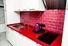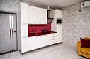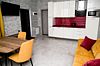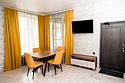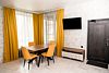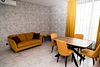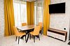 Площадь номера составляет пятьдесят квадратных метров. Две комнаты, большая двуспальная кровать (сто восемьдесят сантиметров) и двухместный диван в гостиной, оборудованная мини-кухня с плитой, холодильником и микроволновой печью, столовая зона и стиральная машина.