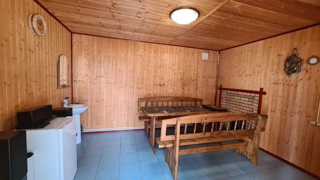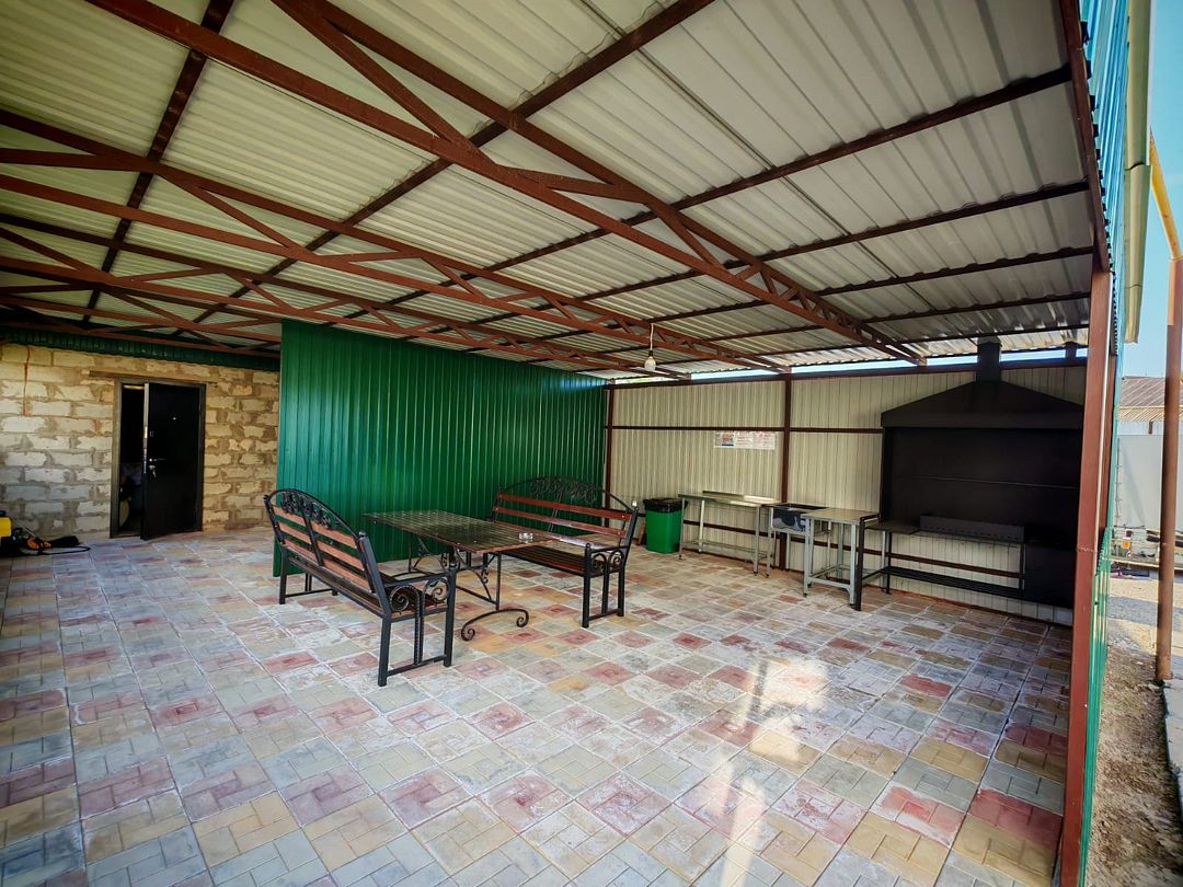 Кухня расположена на улице, в распоряжении гостей также находится беседка с большими столами, газовая плитка, казан для приготовления пищи на дровах, мангал и освещение.