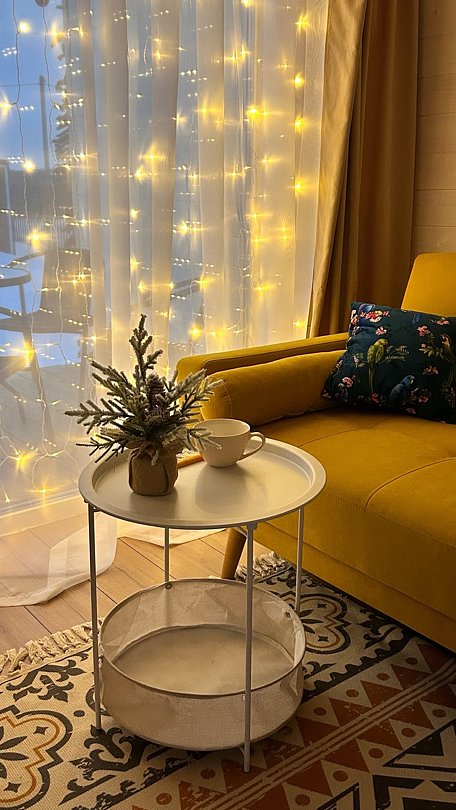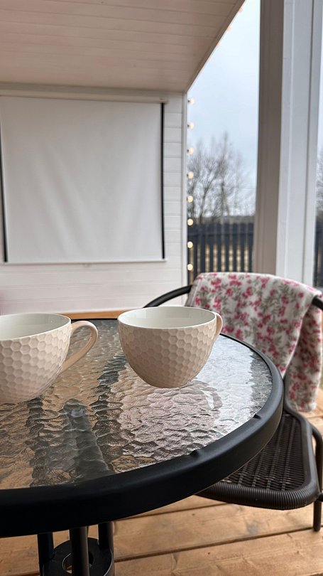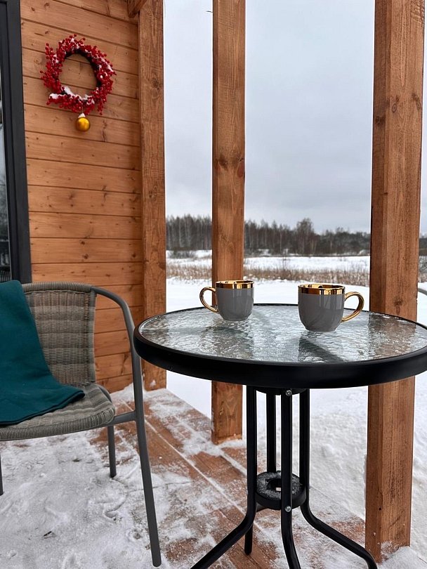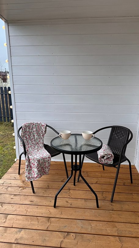 - на открытой террасе столик со стульями, теплые и мягкие пледы;