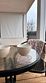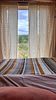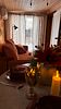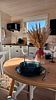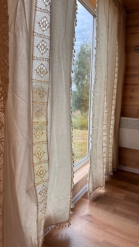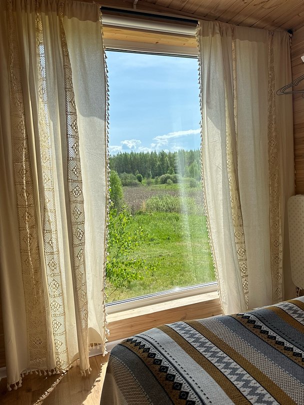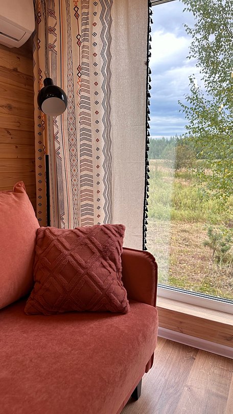 Интерьер очень уютный, в теплой гамме, с элементами бохо, эко-стиль. Вид из панорамных окон не во внутренний двор, а на лесные пейзажи и поля.