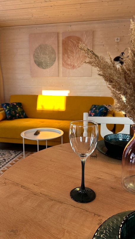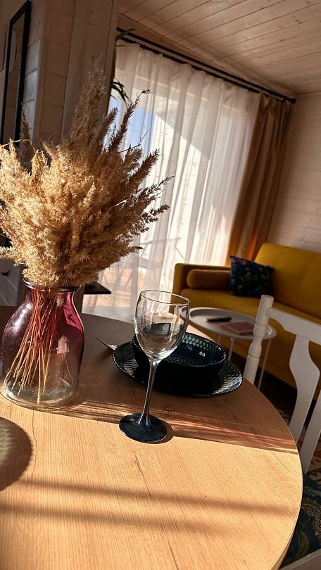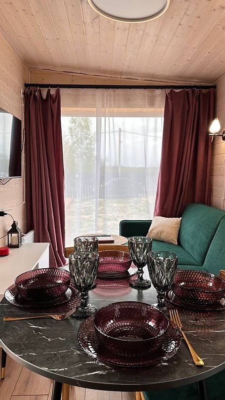 Яркий, стильный дом с панорамным остеклением и террасой. Полностью оборудован всем необходимым для комфортного времяпровождения. Интерьер стильный, изумрудно-брусничный с золотыми акцентами.