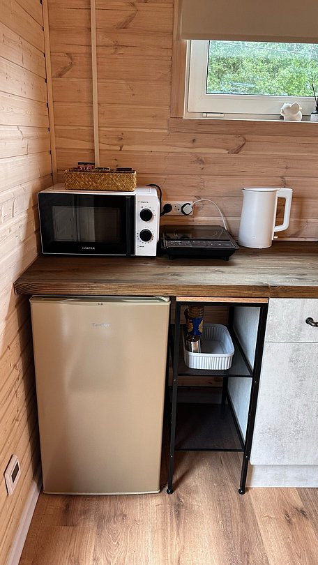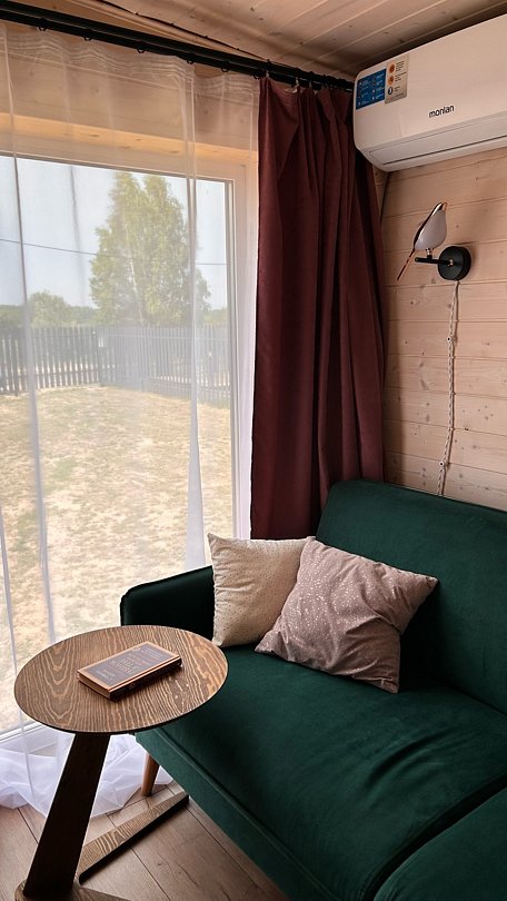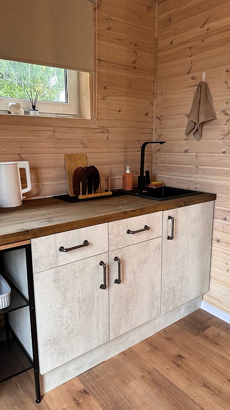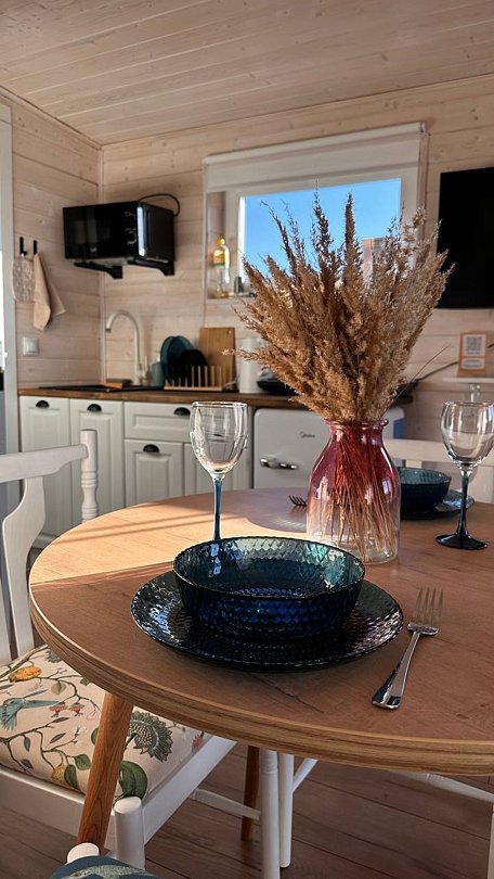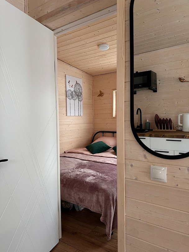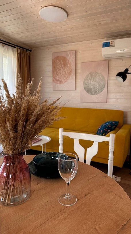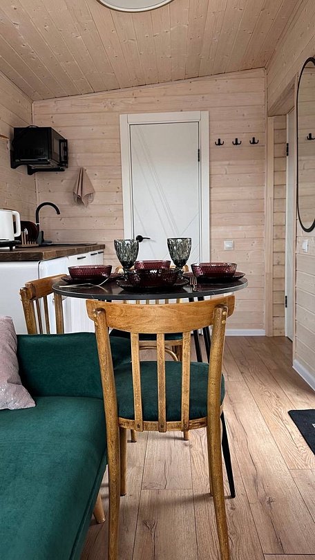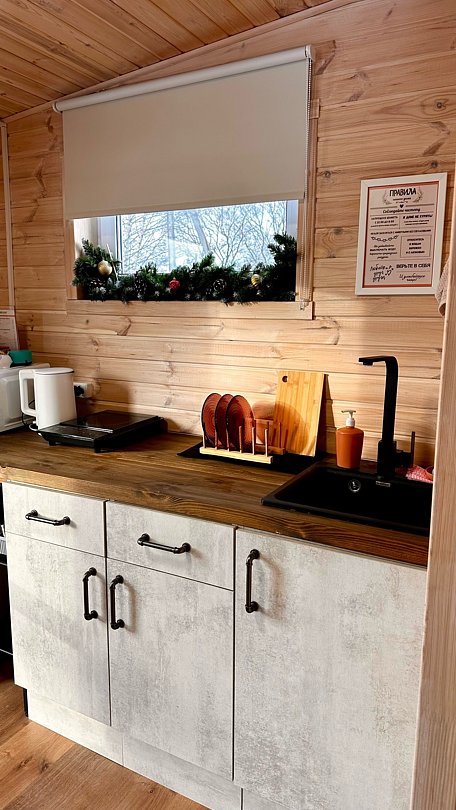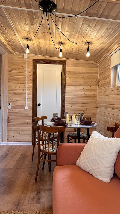 Каждый домик оборудован собственной зоной барбекю с мангалом, решеткой, розжигом и углём. Внутри вас ждёт уютная спальная зона с двуспальной кроватью и раскладным диваном. Для вашего удобства предусмотрена полностью укомплектованная кухня с красивой посудой, индукционной плитой, микроволновкой, холодильником и электрическим чайником. К вашим услугам базовые продукты: чай, кофе, сахар и специи.