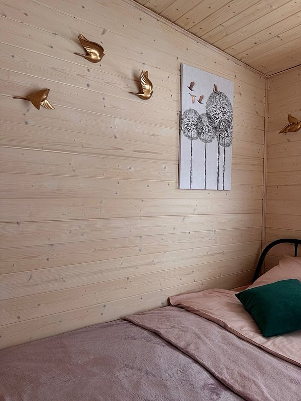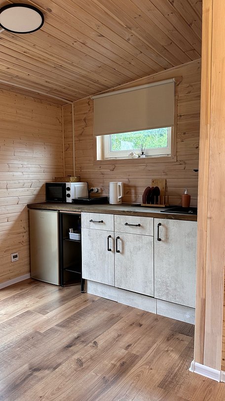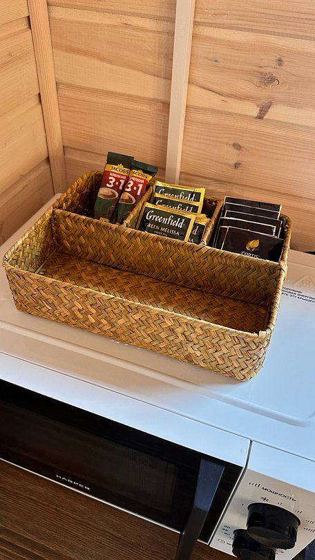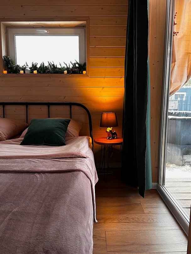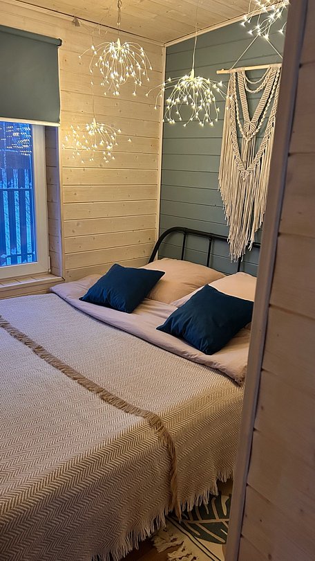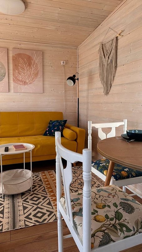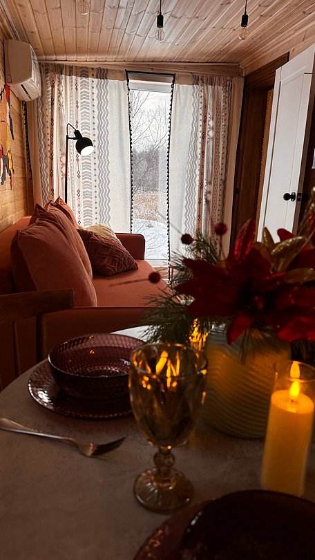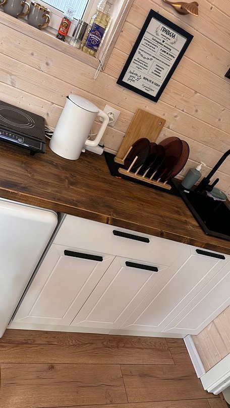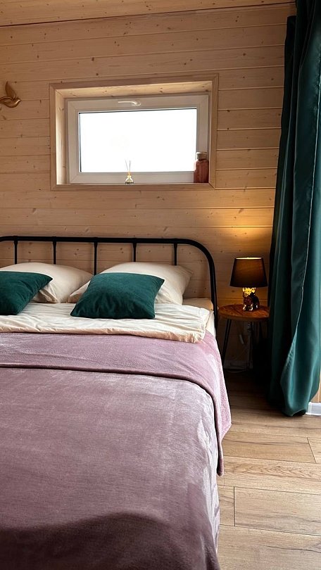 Каждый домик оборудован собственной зоной барбекю с мангалом, решеткой, розжигом и углём. Внутри вас ждёт уютная спальная зона с двуспальной кроватью и раскладным диваном. Для вашего удобства предусмотрена полностью укомплектованная кухня с красивой посудой, индукционной плитой, микроволновкой, холодильником и электрическим чайником. К вашим услугам базовые продукты: чай, кофе, сахар и специи.