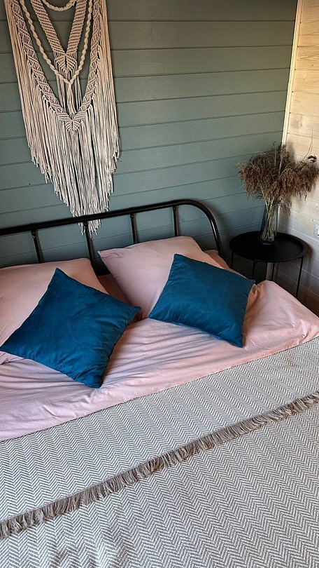 Интерьер в теплой гамме, с элементами бохо и эко-стиля. Особенности: проектор, баня на территории дома. Проектор — бесплатно. Баня оплачивается отдельно.