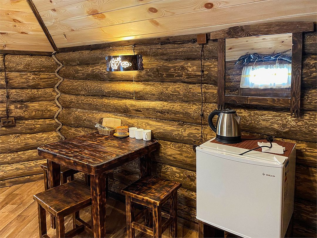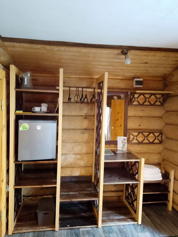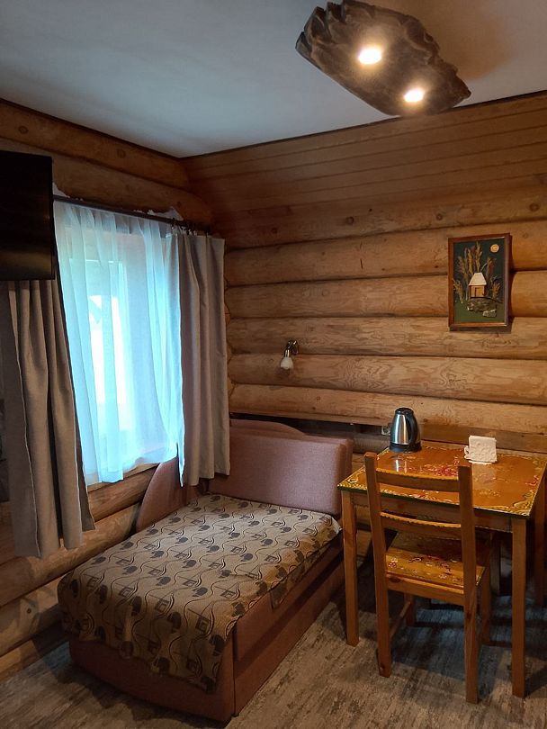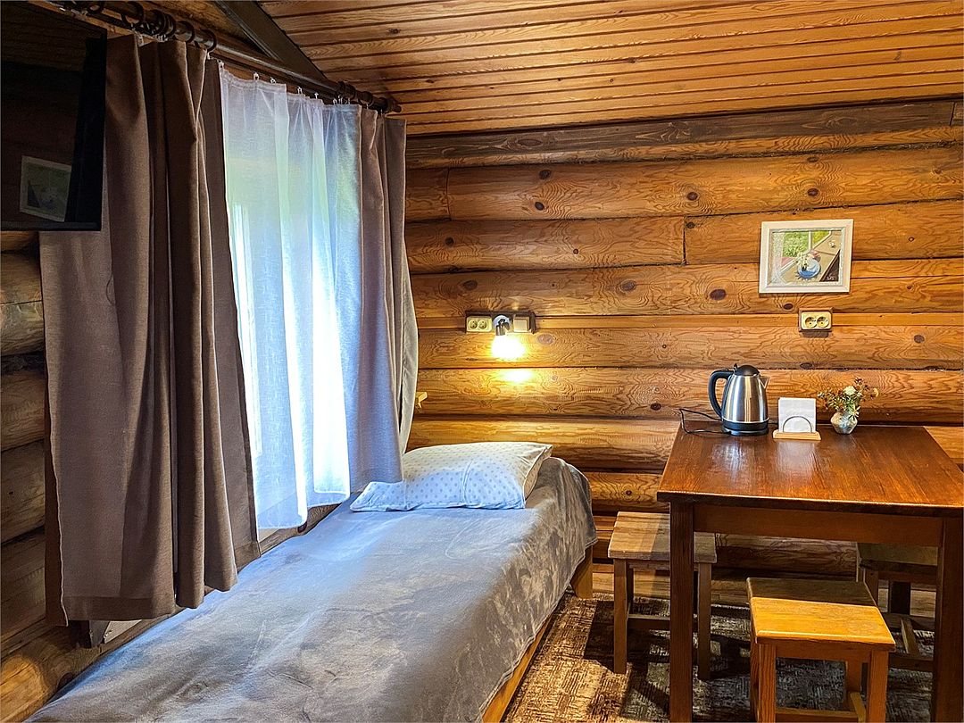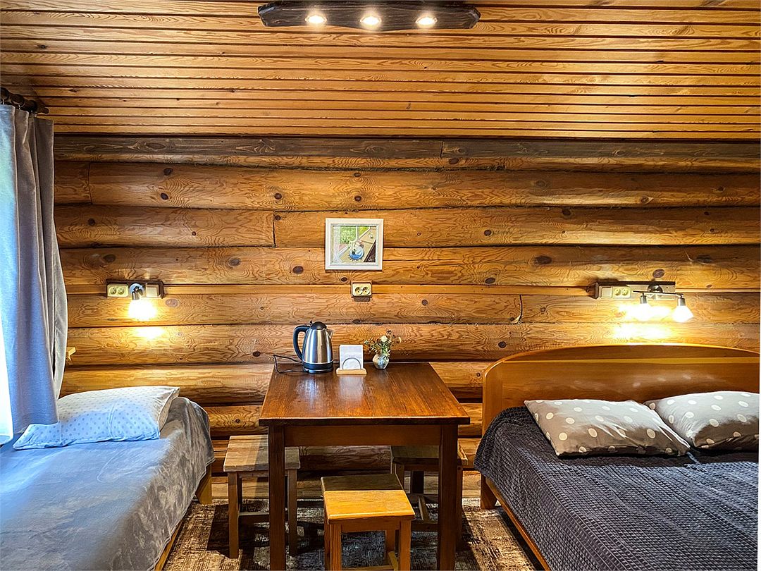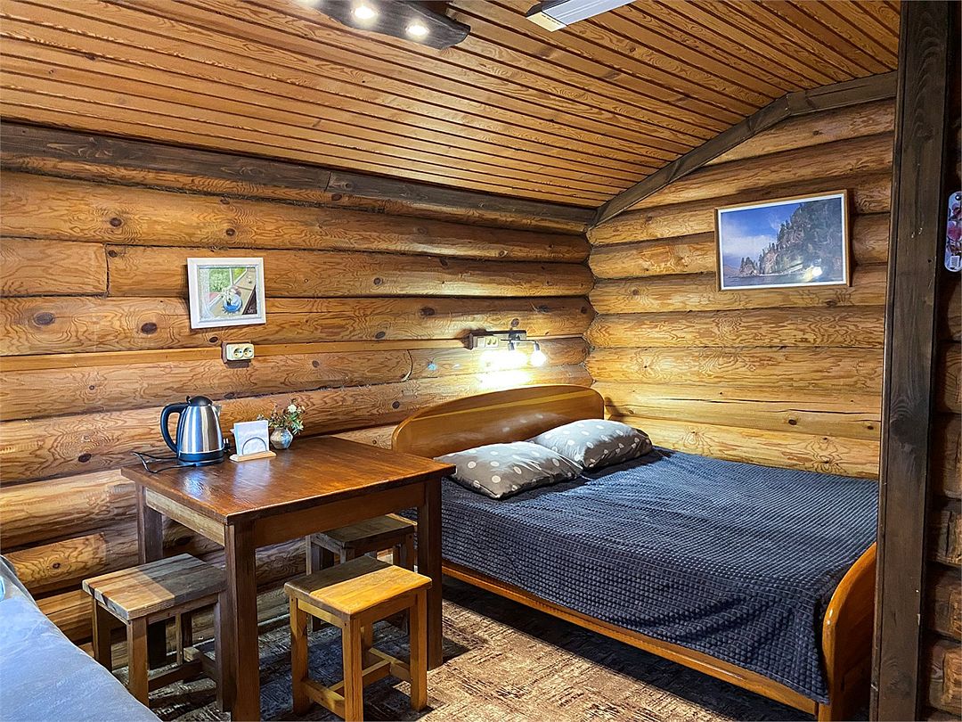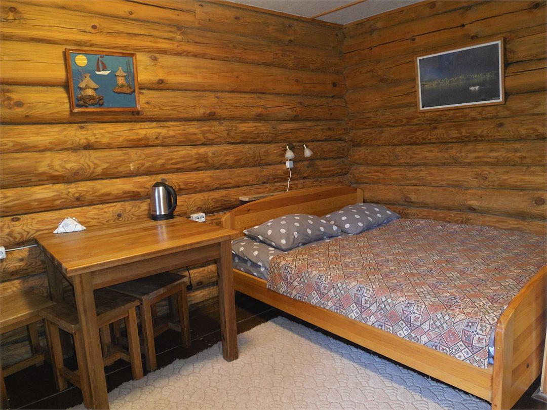 Стандарт 1 категории. Рубленный дом из сосны, отдельно стоящий. Двуспальная кровать, односпальная кровать. Обеденная зона, холодильник, чайник, набор посуды, гардероб. Душ, туалет, г/х вода, фен.