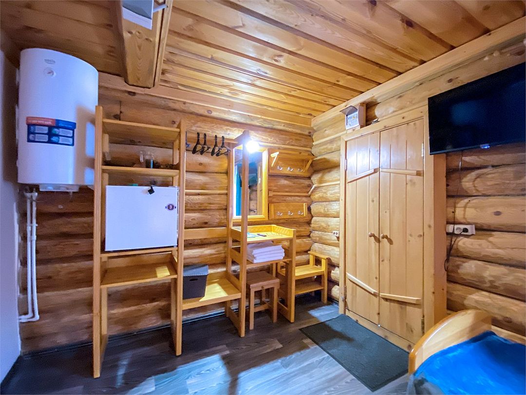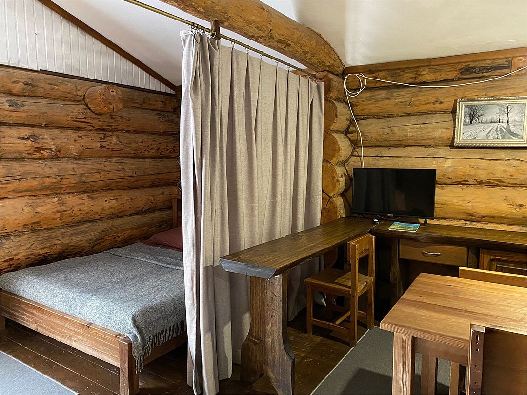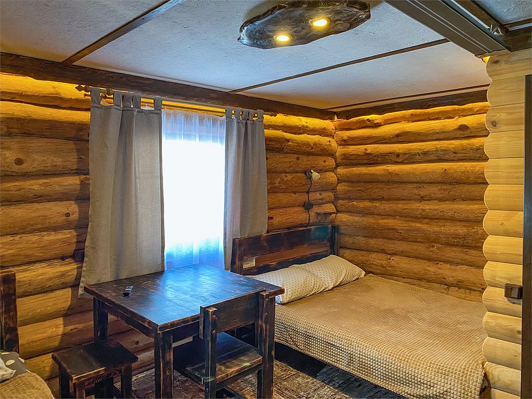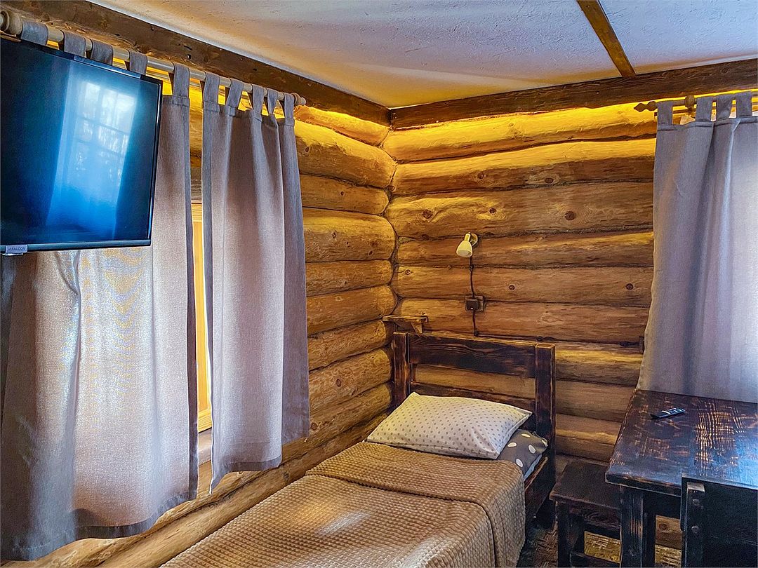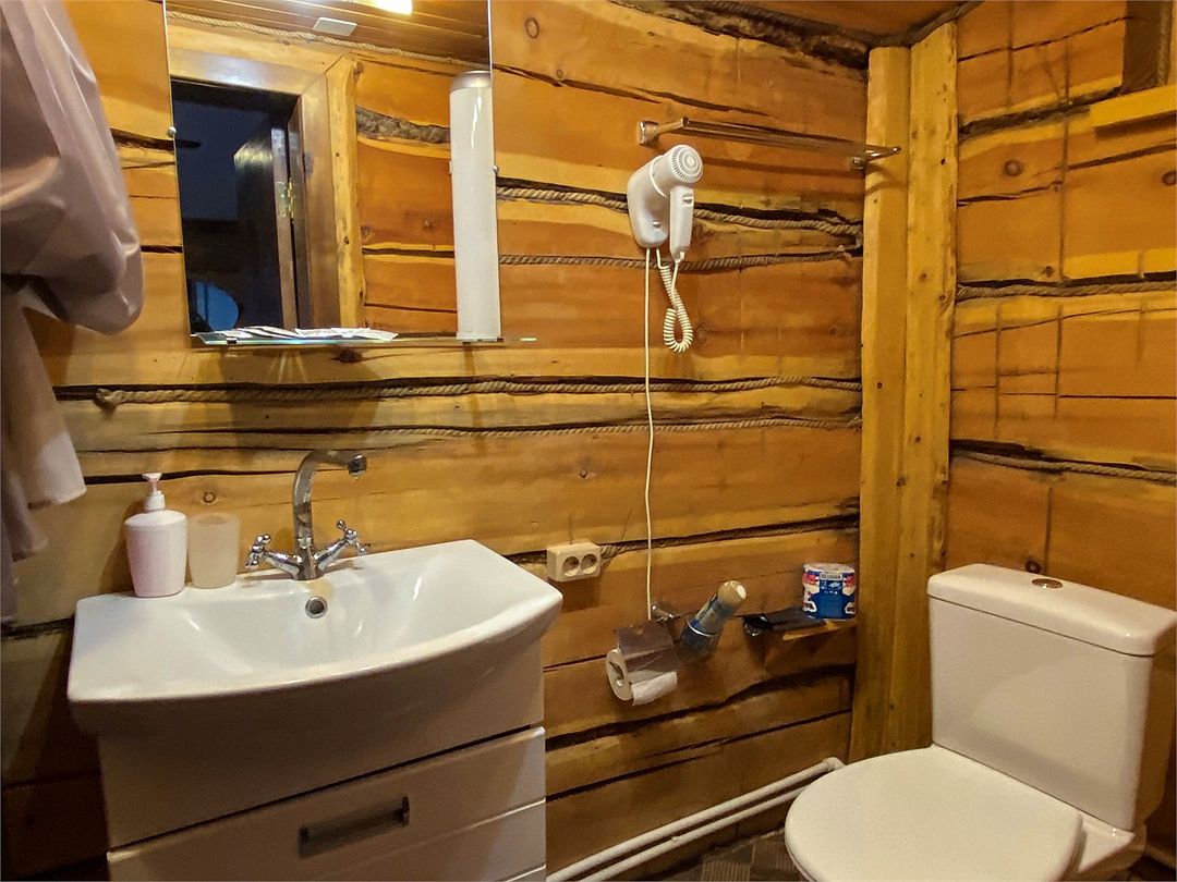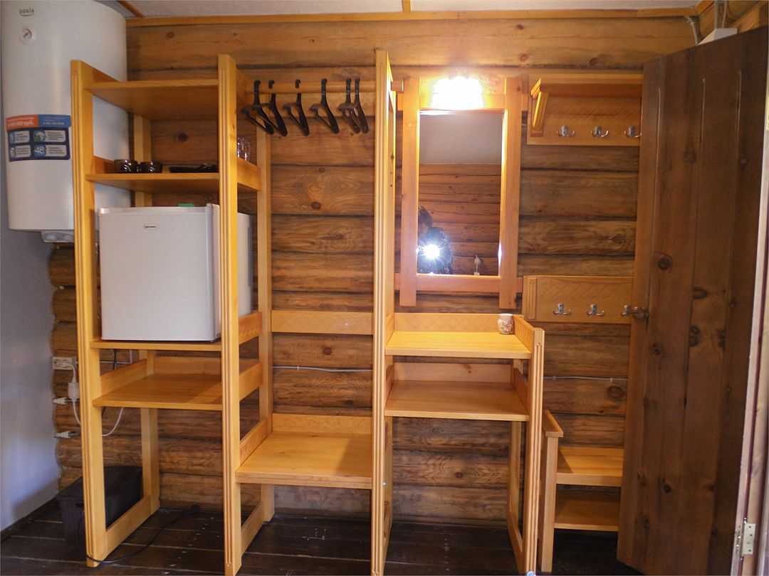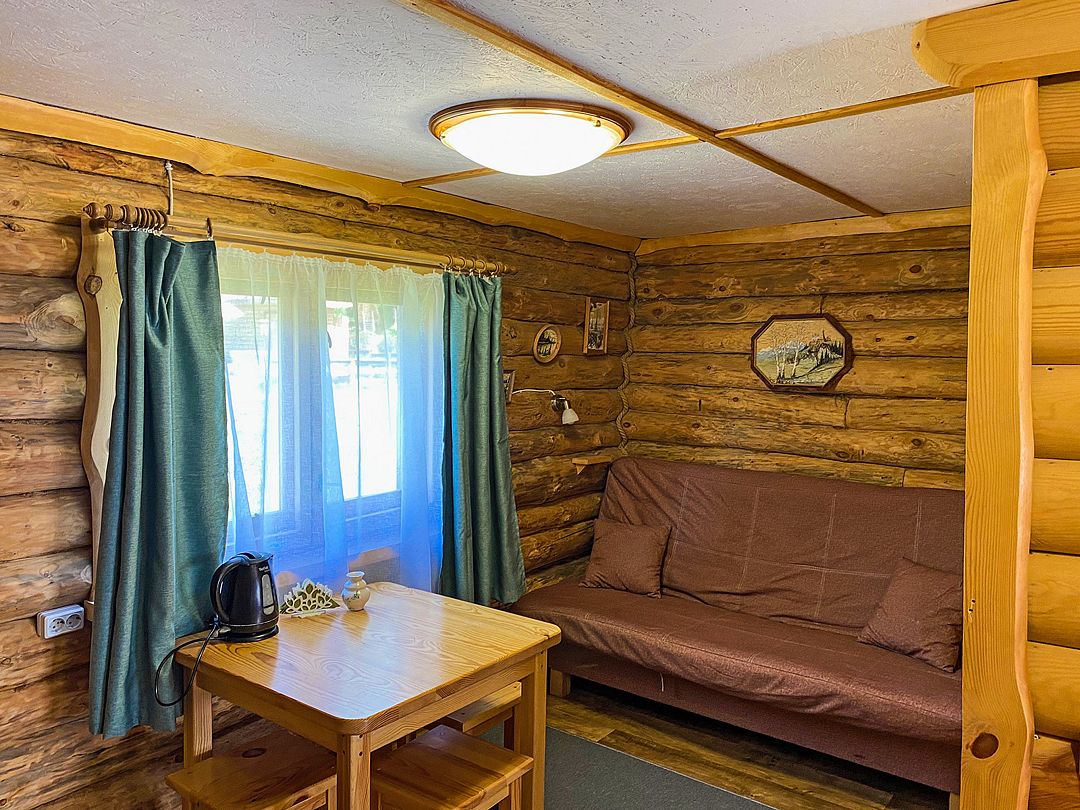 Стандарт 1 категории. Рубленный дом из сосны, отдельно стоящий. Двуспальная кровать, односпальная кровать. Обеденная зона, холодильник, чайник, набор посуды, гардероб. Душ, туалет, г/х вода, фен.