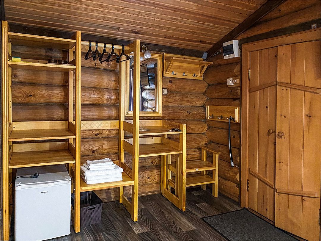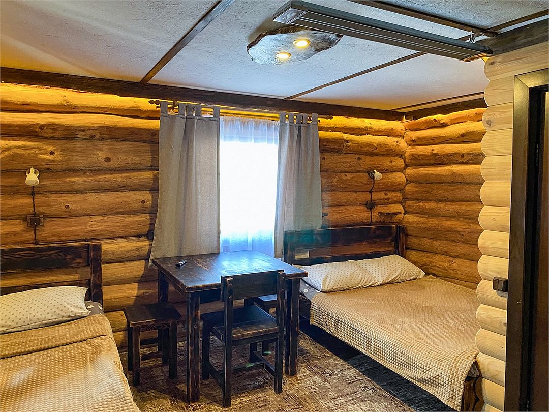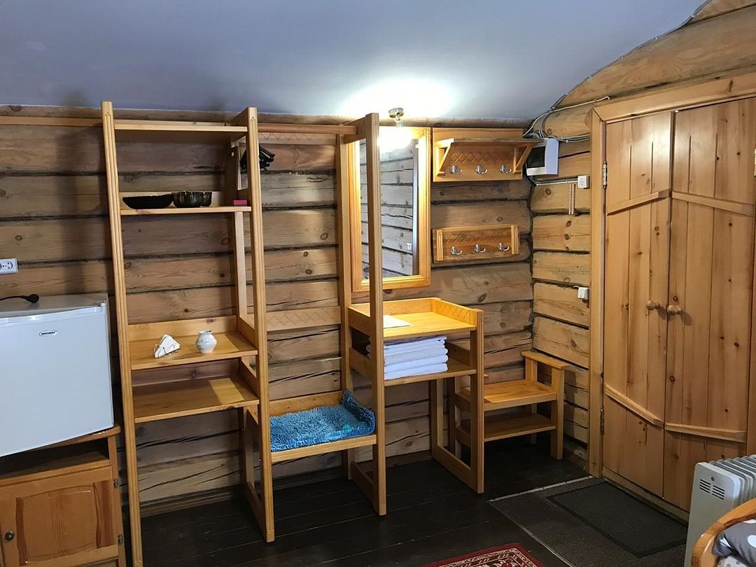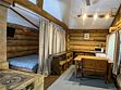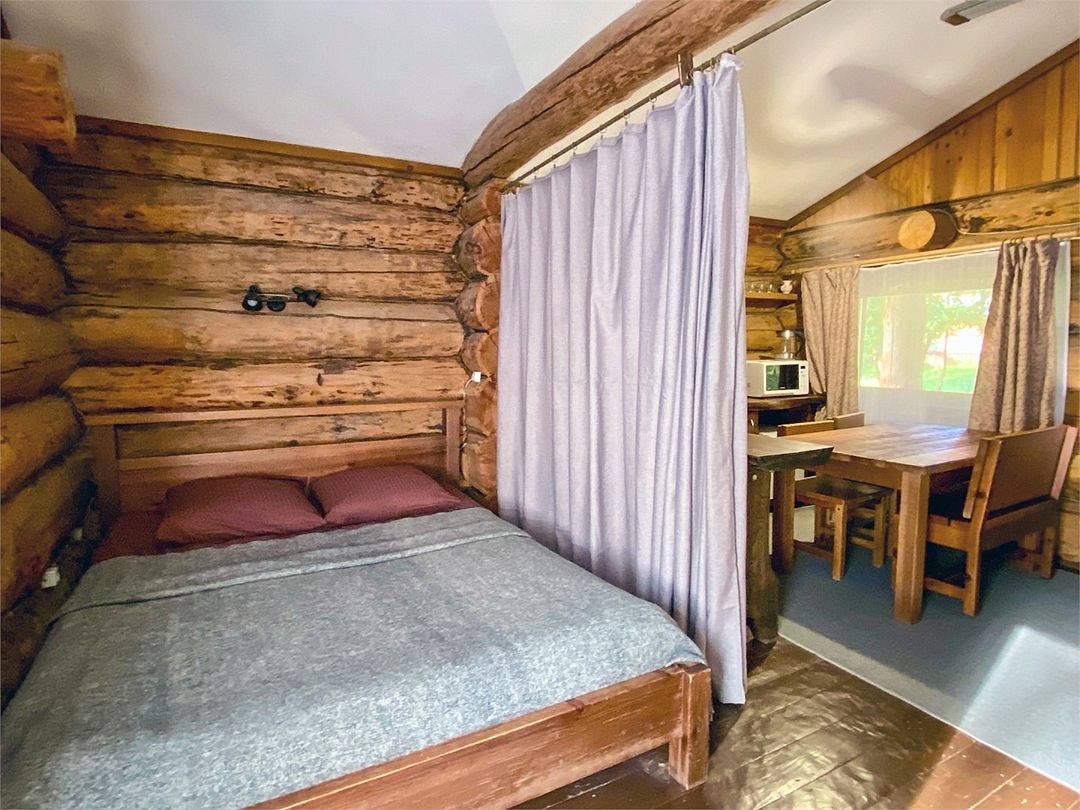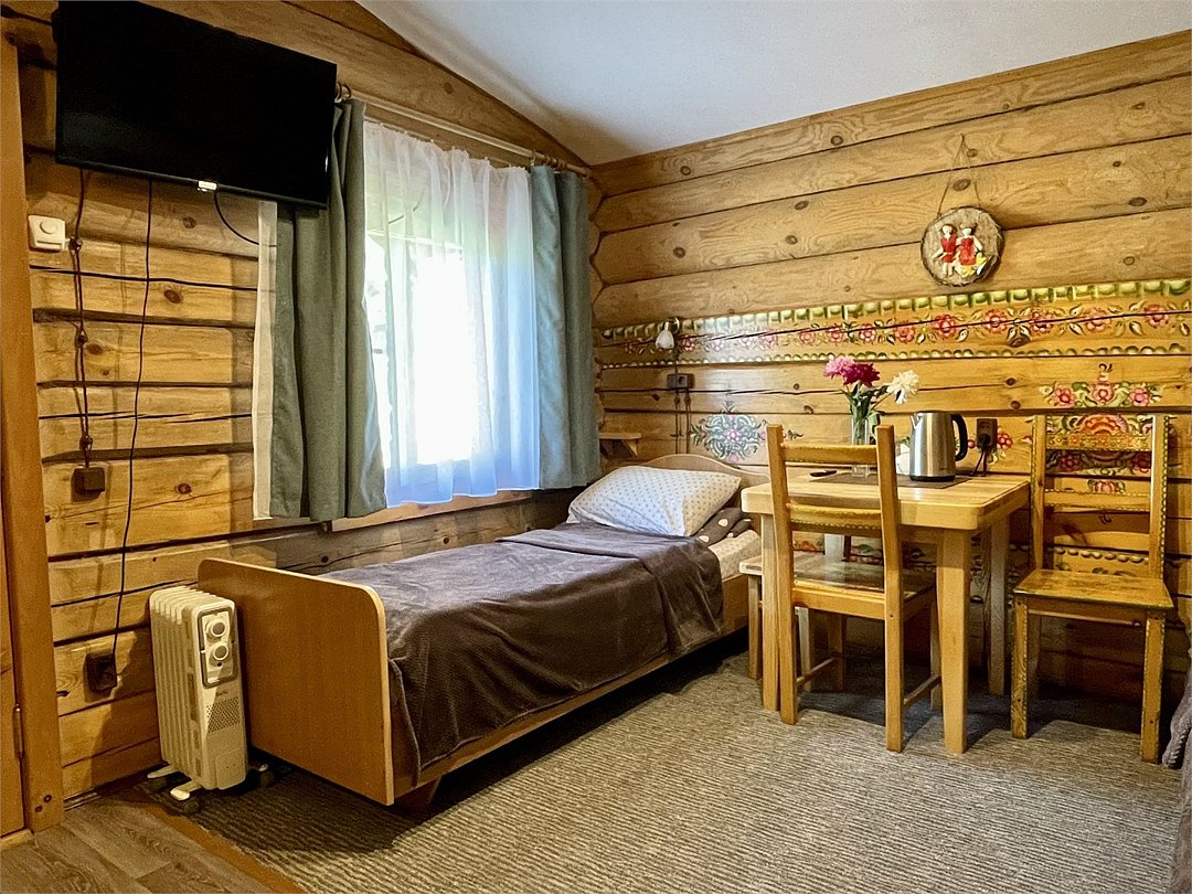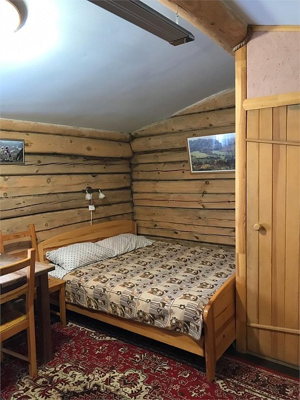 Стандарт 1 категории. Рубленный дом из сосны, отдельно стоящий. Двуспальная кровать, односпальная кровать. Обеденная зона, холодильник, чайник, набор посуды, гардероб. Душ, туалет, г/х вода, фен.