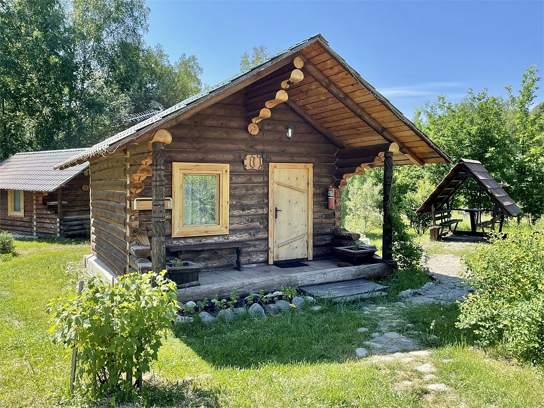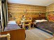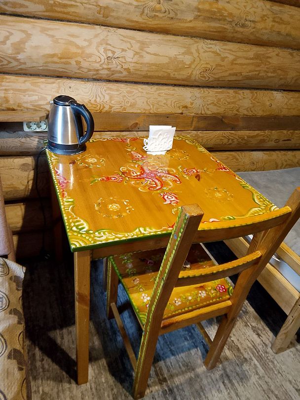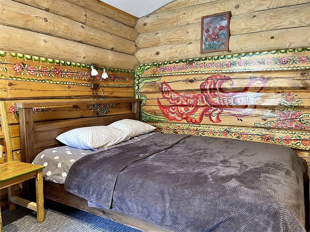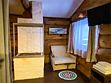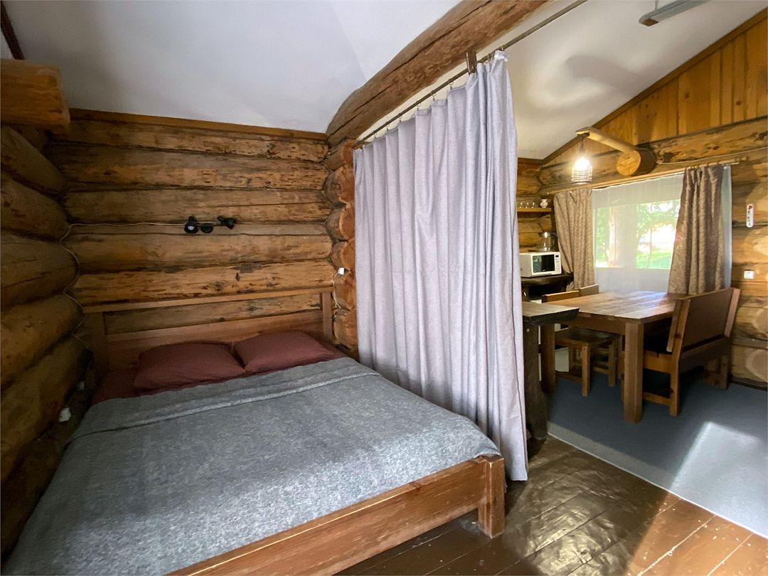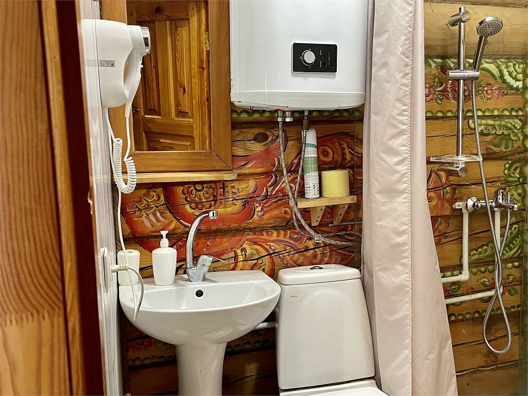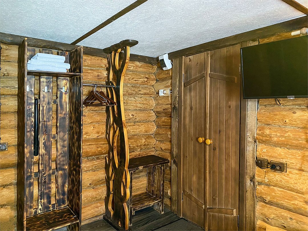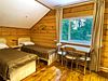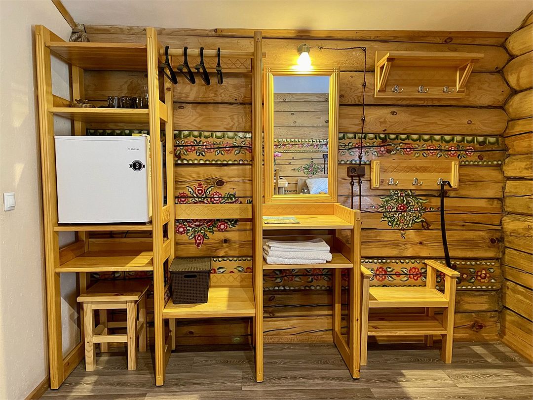 Стандарт 1 категории. Рубленный дом из сосны, отдельно стоящий. Двуспальная кровать, односпальная кровать. Обеденная зона, холодильник, чайник, набор посуды, гардероб. Душ, туалет, г/х вода, фен.