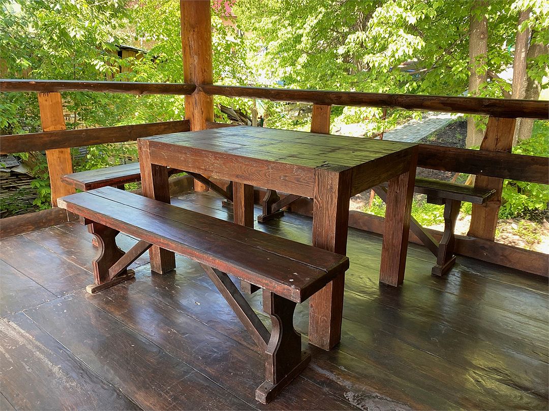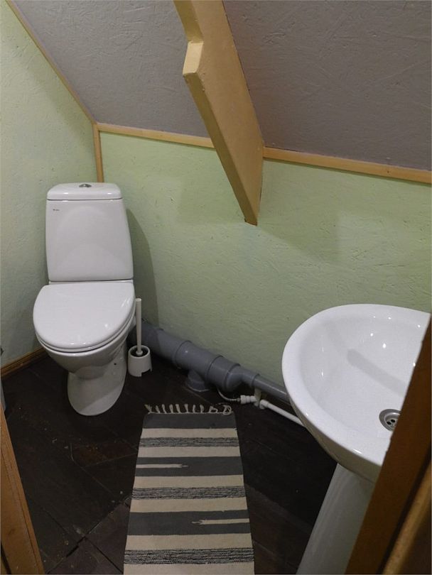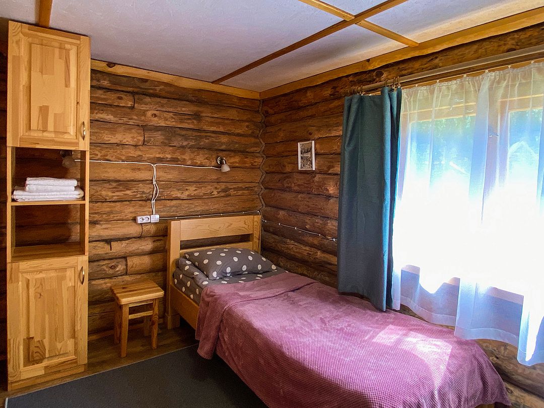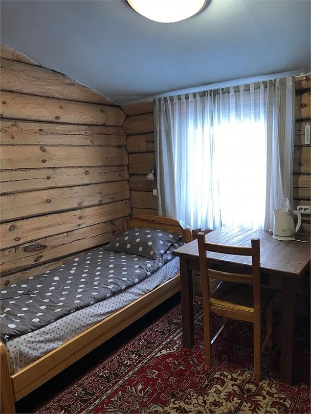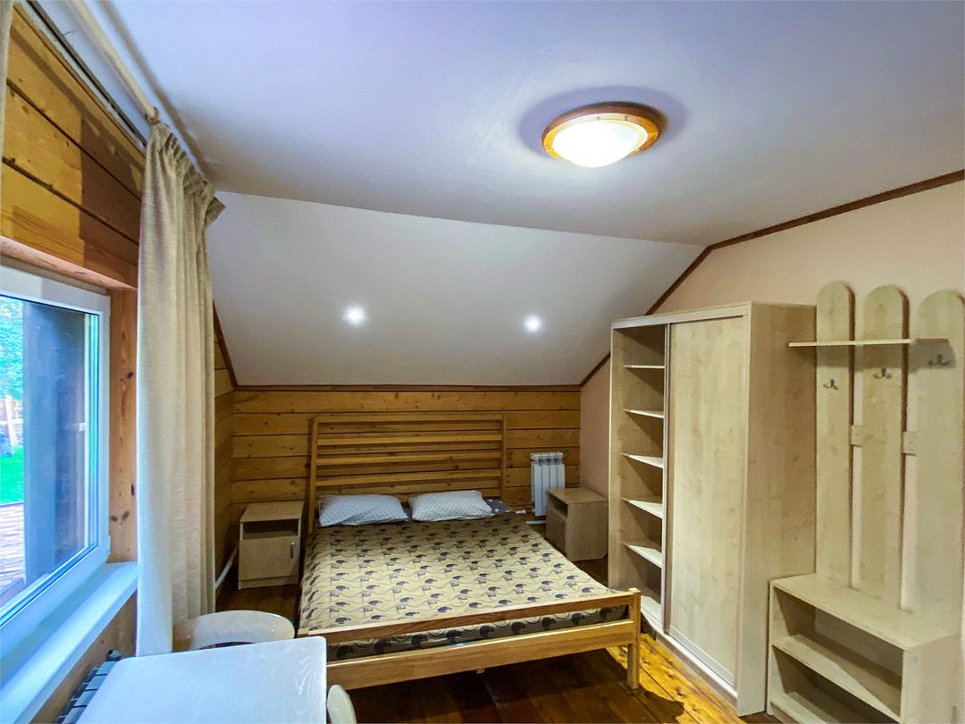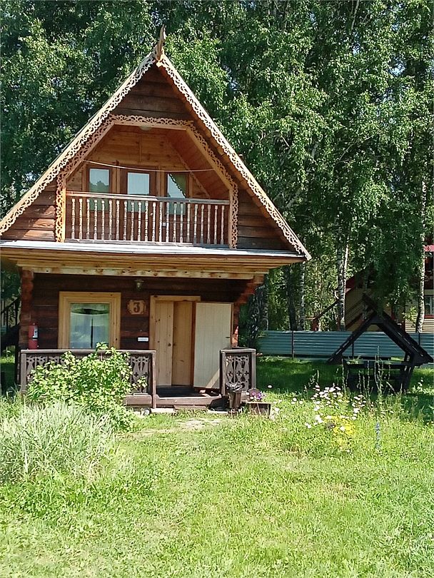 Рубленный дом из сосны, отдельно стоящий. 2 этаж с балконом. Отдельный вход. Три односпальных кровати, вешалка для одежды. Стол, стулья, чайник, чашки. Туалет, раковина, г/х вода. Полотенце.