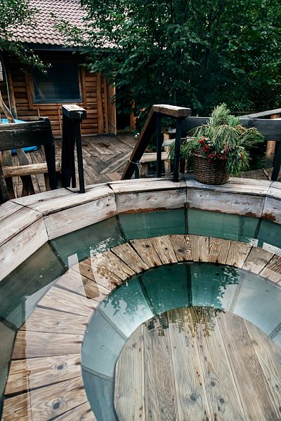 Древнейшая традиция, сказочное действо: купание и распаривание в большом чане над открытым пламенем. Энергия пяти стихий – воды, огня, воздуха, металла и дерева. И все это в паре шагов от вашего домика.