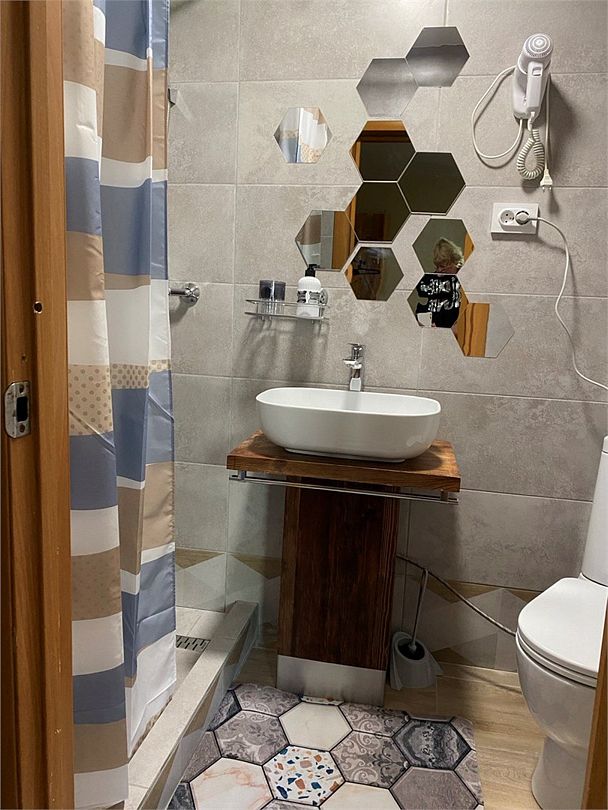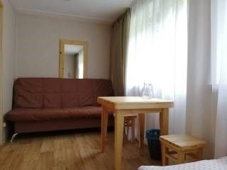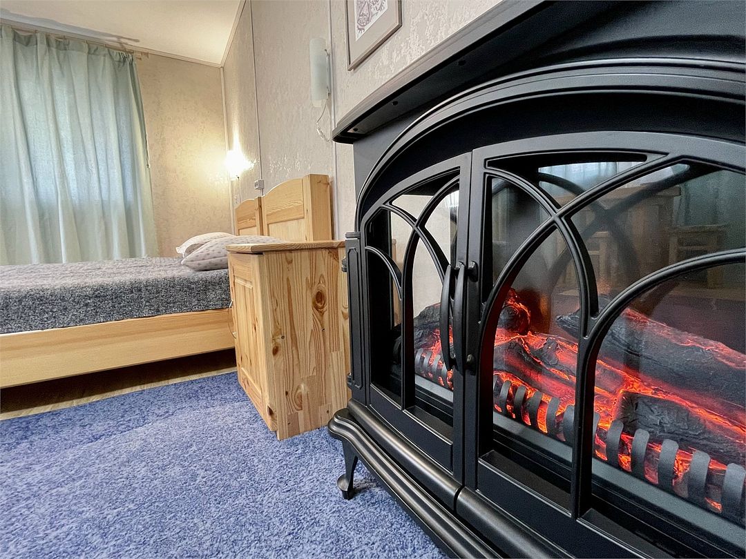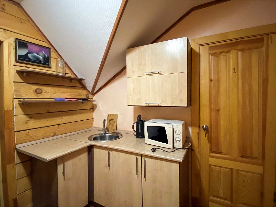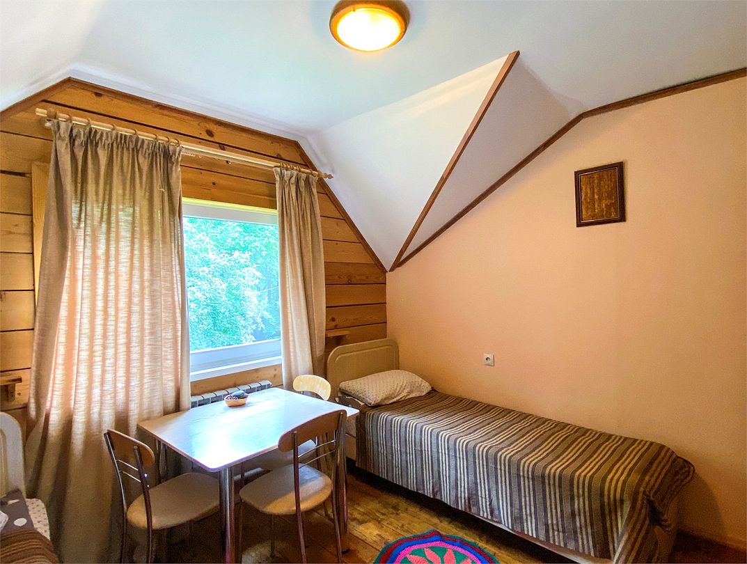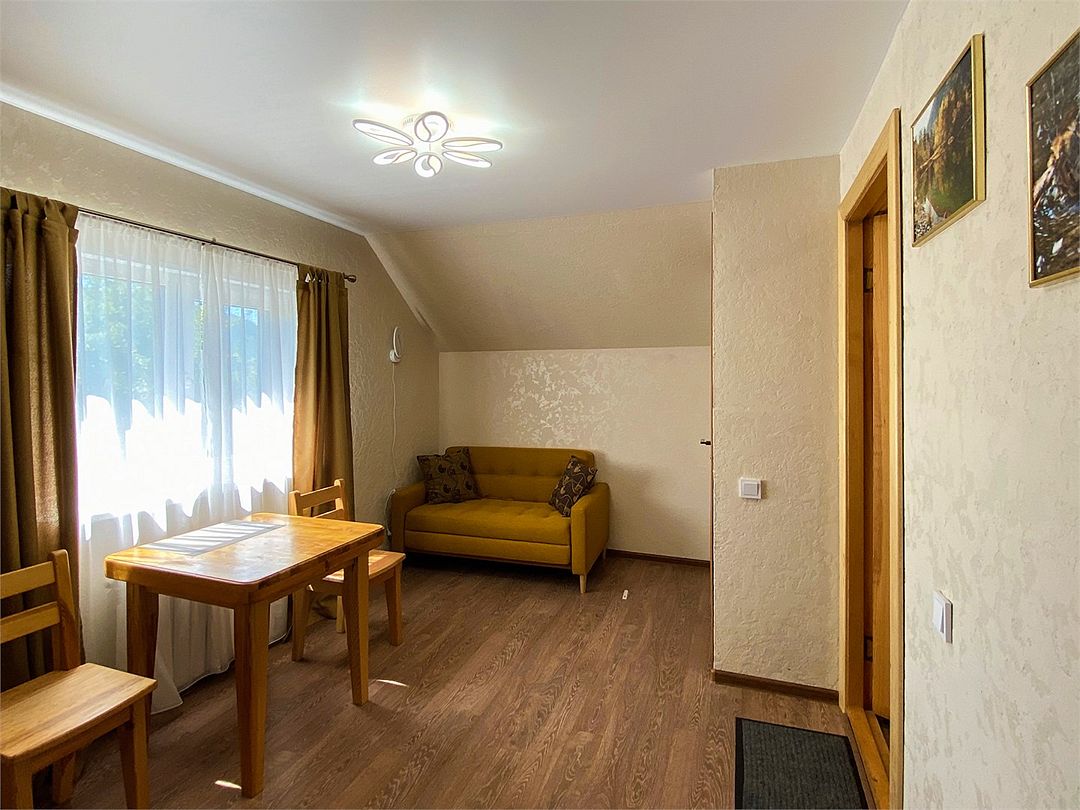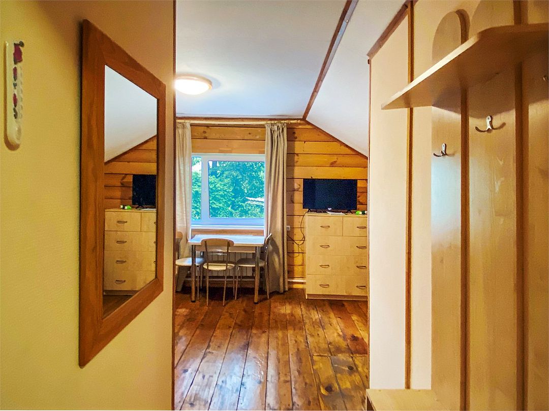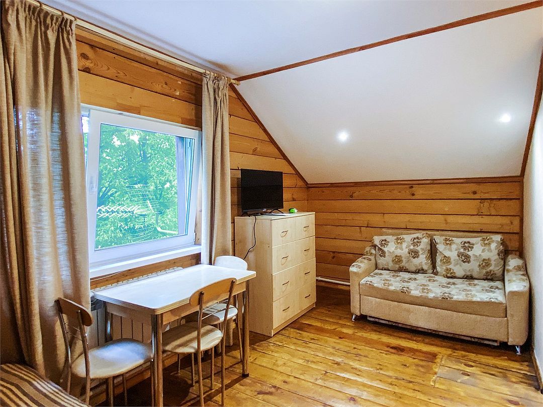 На первом этаже находится однокомнатный номер площадью 23 м² с отдельным входом и небольшой террасой. В номере: две односпальные кровати, двуспальный диван, электрокамин, тумбы, шкаф, стол, стулья, телевизор, холодильник, чайник, фен, обогреватель, Wi-Fi, постельное белье, посуда, туалет и душ.