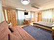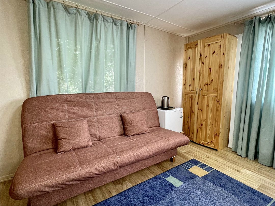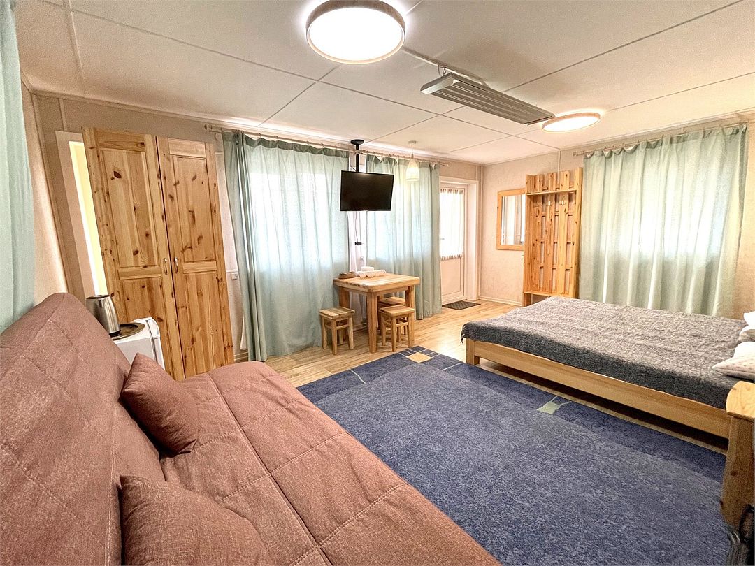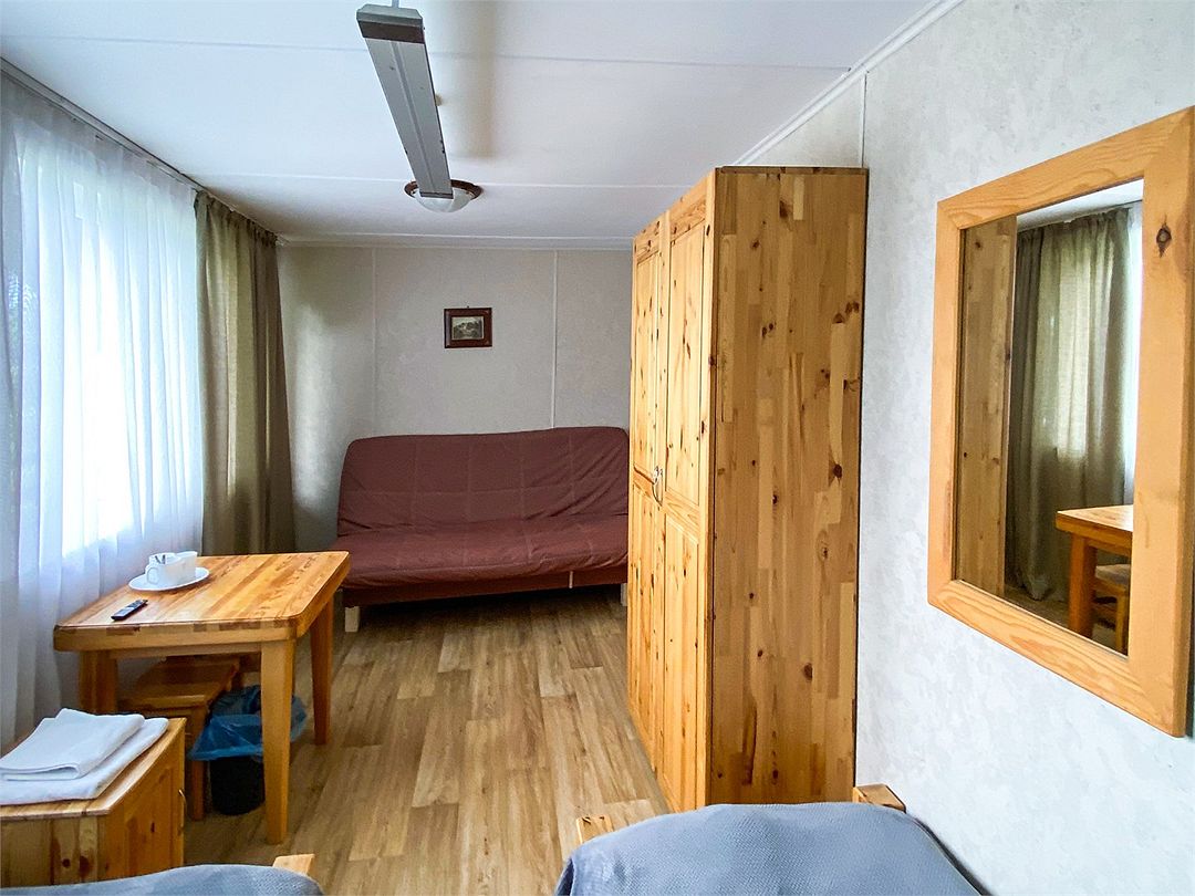 Стандарт 1 категории. Две односпальные кровати, двухспальный диван. Обеденная зона, холодильник, чайник, набор посуды, гардероб. Душ, туалет, г/х вода, фен.