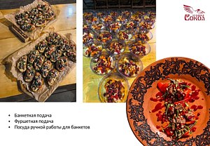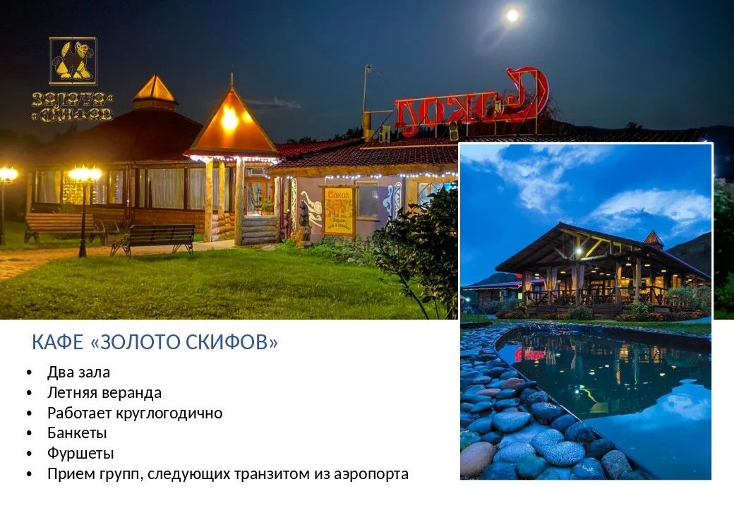 В кафе «Золото скифов» вас ждет домашняя кухня из местных продуктов, авторские блюда, мед и дары с собственной пасеки. Для любителей барбекю рядом с каждым домиком предусмотрена своя зона. Также имеется летняя веранда, идеально подходящая для проведения банкетов и торжеств.