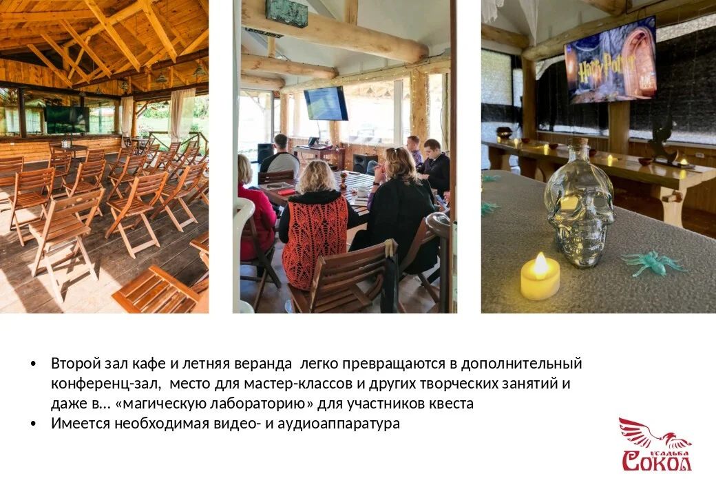 Зал кафе легко преобразуется в конференц-зал, имеется все необходимое видео- и аудиооборудование. Стоимость аренды: от 45000 ₽. Вместимость: до 60 человек.