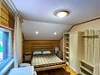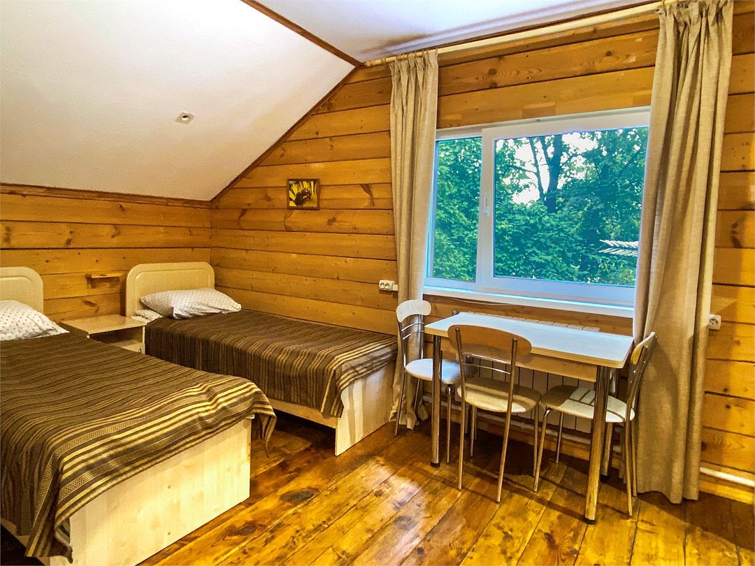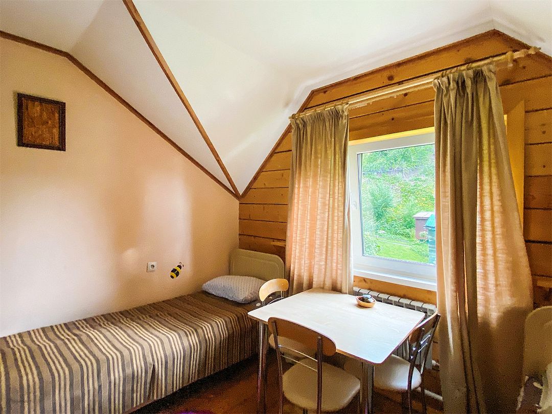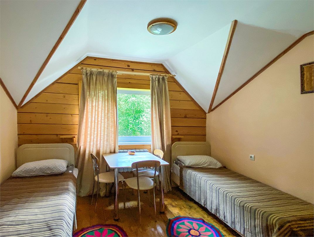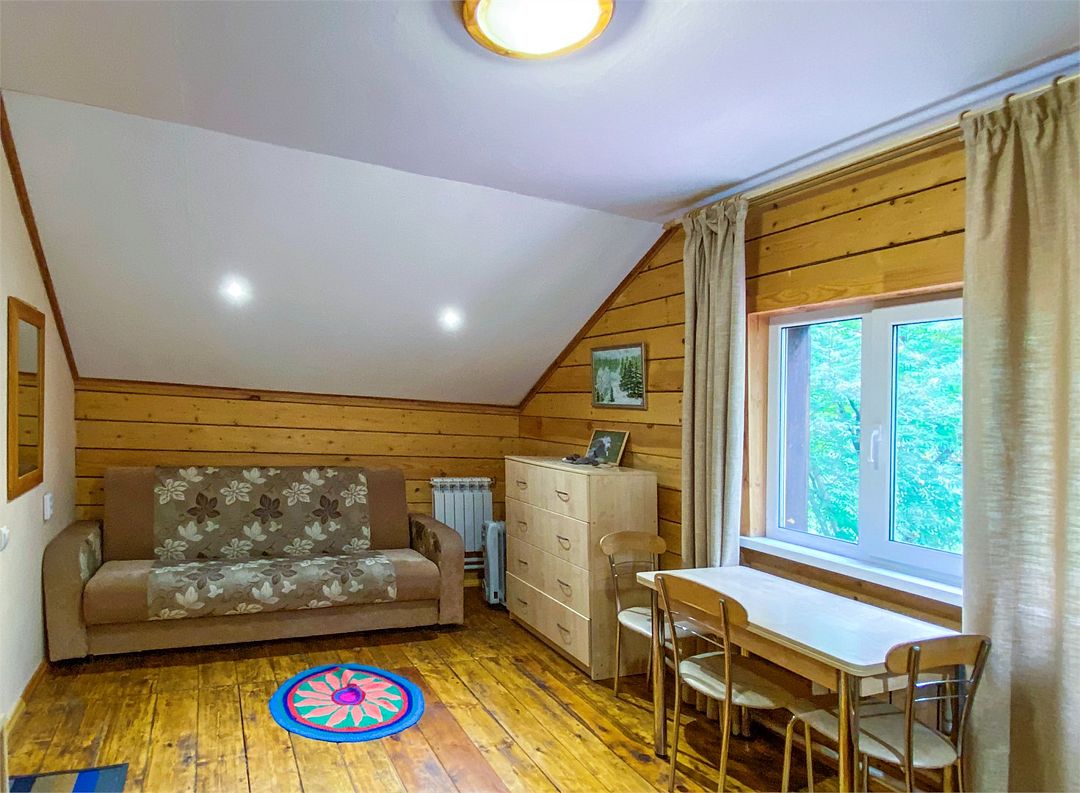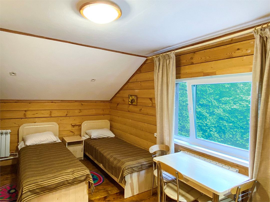 Двухэтажный дом из дерева. 2 этаж, комната с балконом - вид на гору: две односпальные кровати, диван, комплект полотенец. Стол, стулья, гардеробная зона. Душ,wc на этаже.