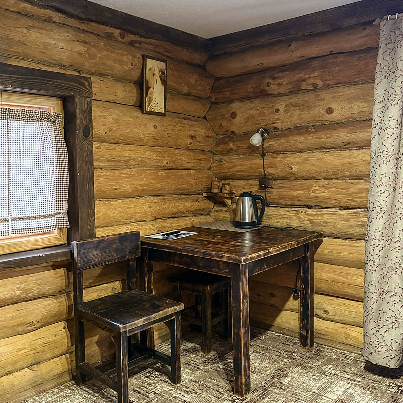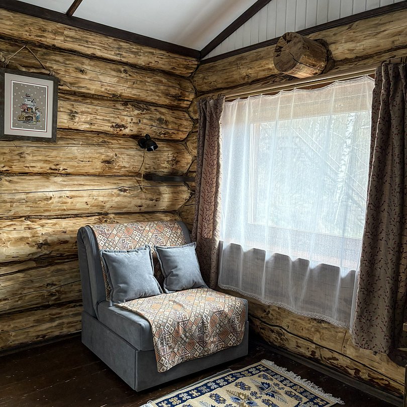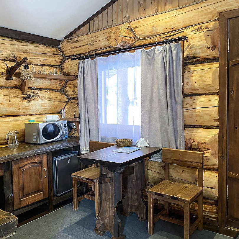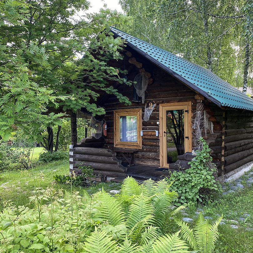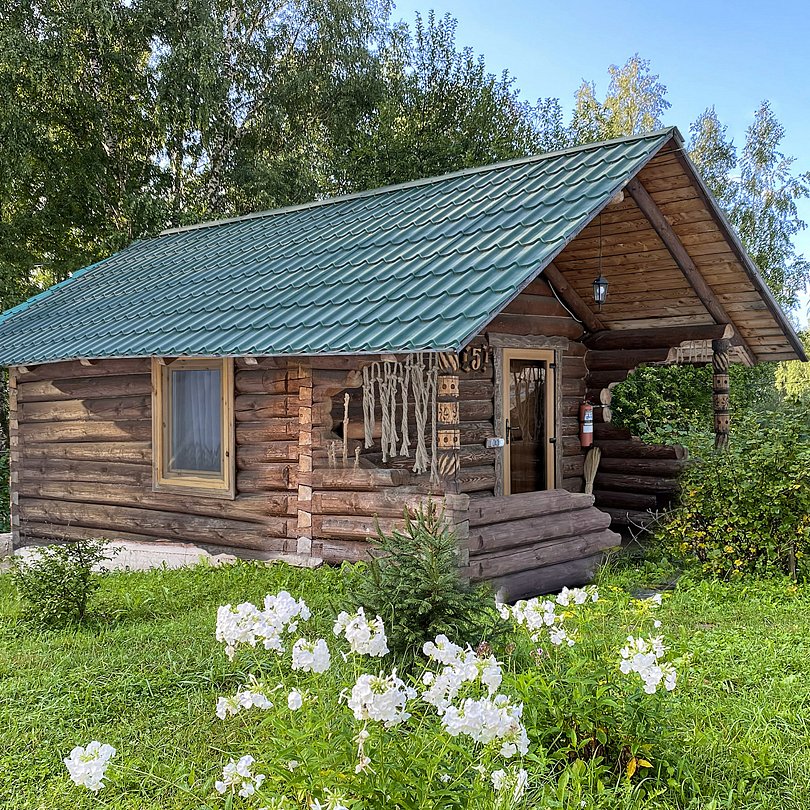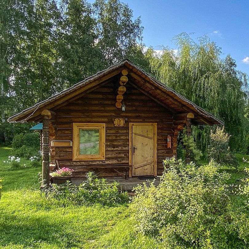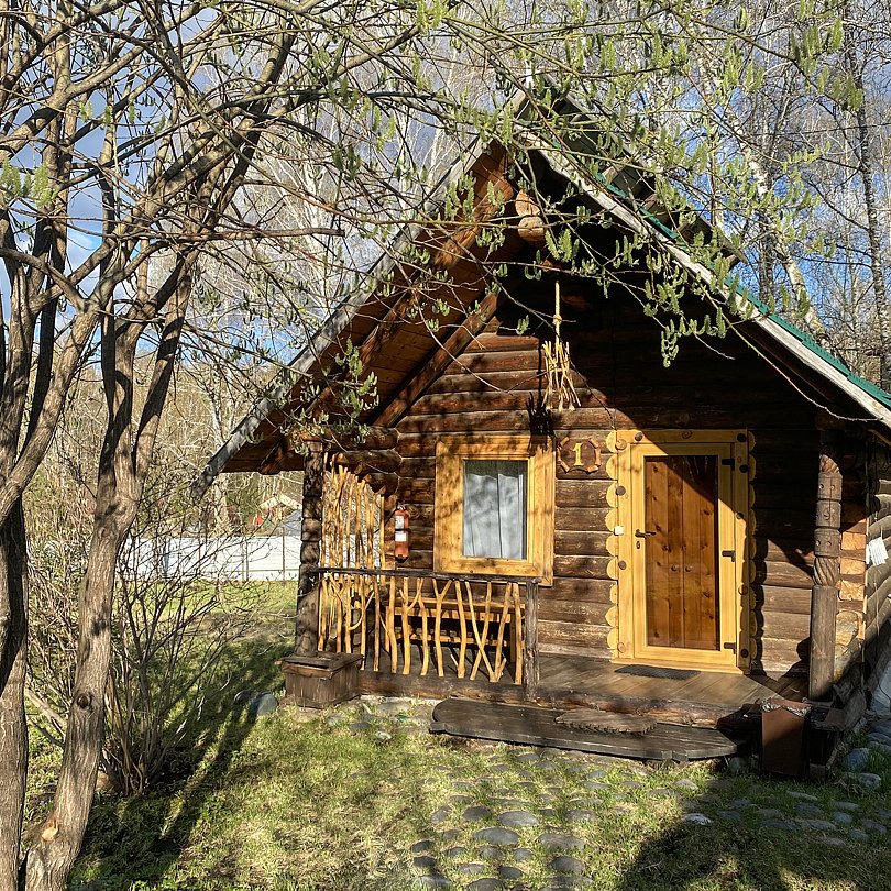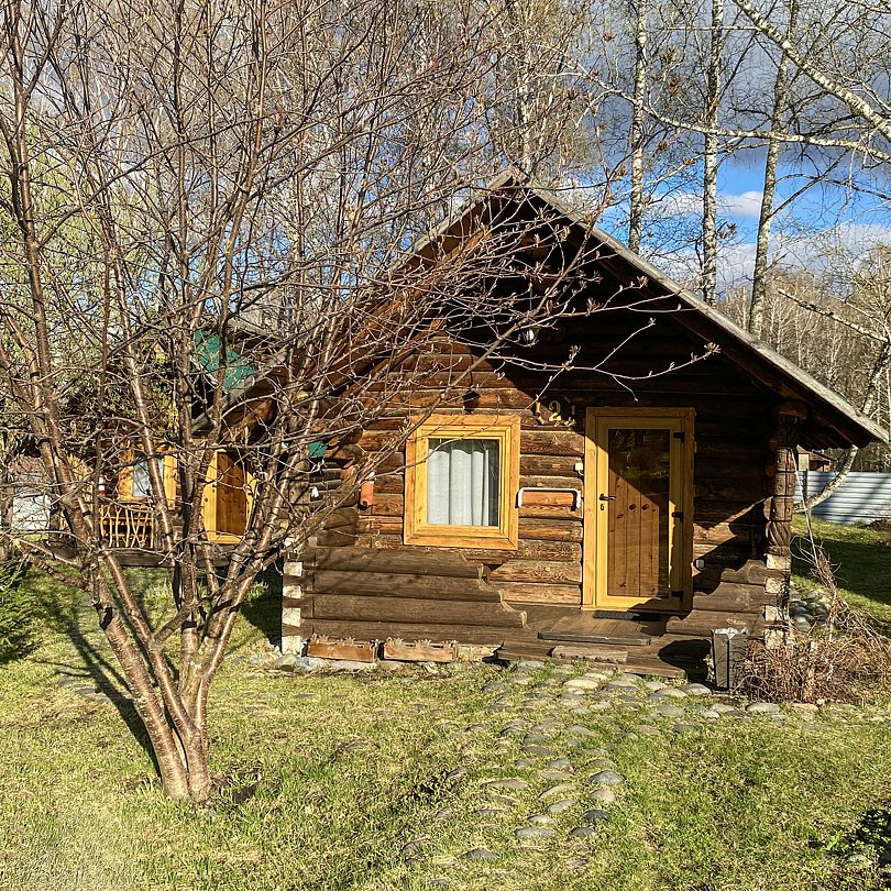 Отдельно стоящий однокомнатный рубленный дом из натуральной сосны, расположенный среди деревьев и кустарников с видом на Усадьбу и горы.