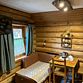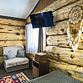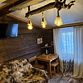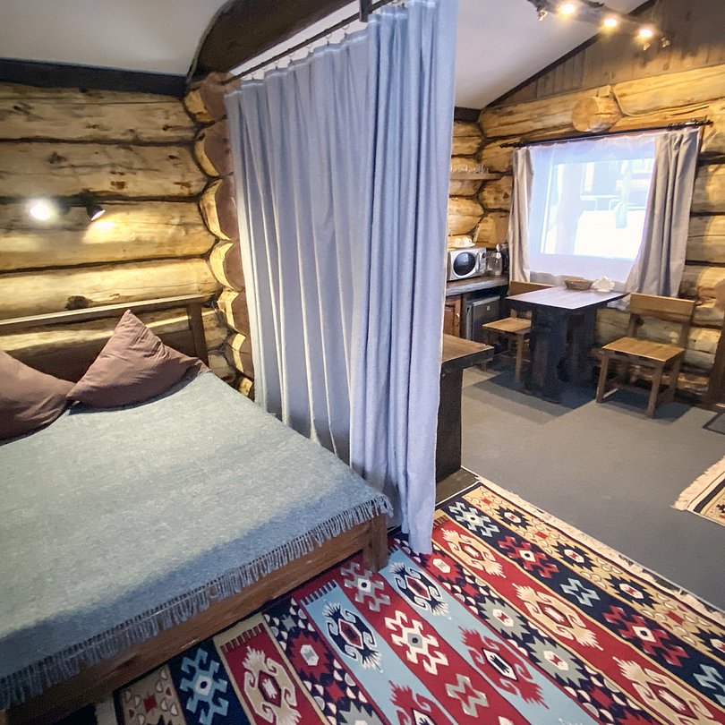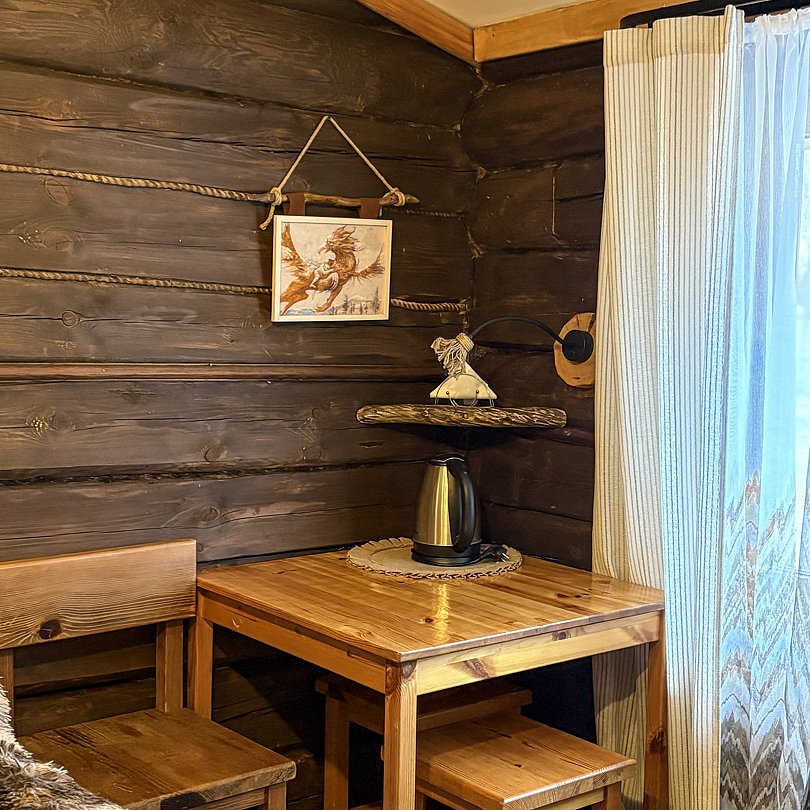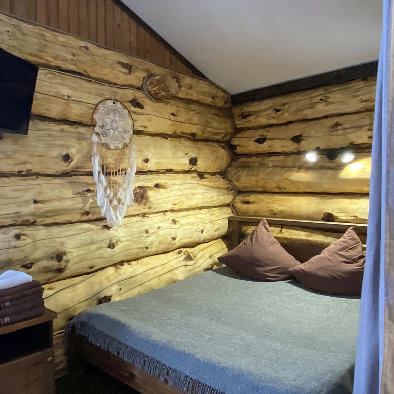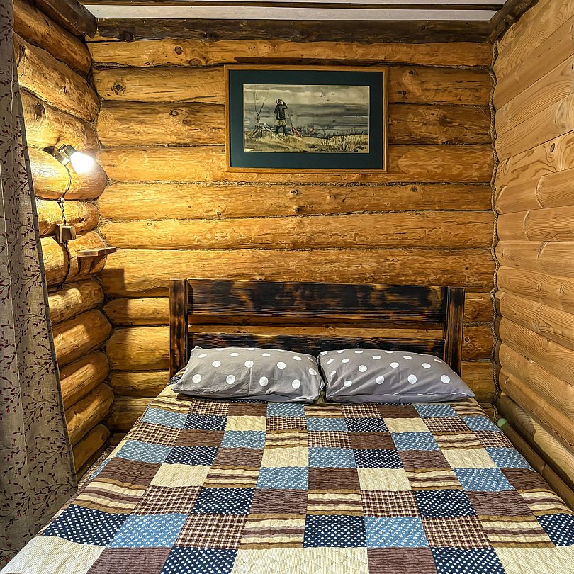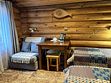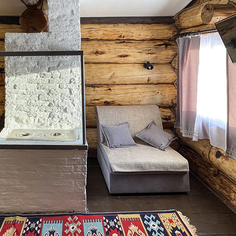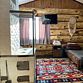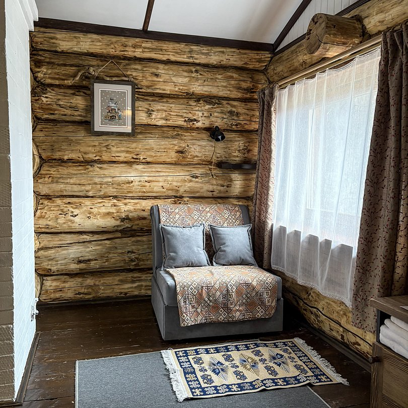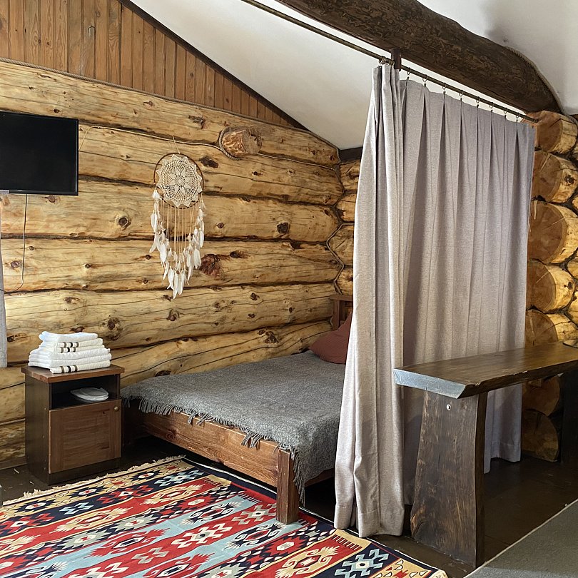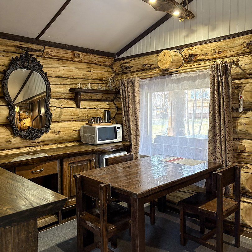 Отдельно стоящий однокомнатный рубленный дом из натуральной сосны, расположенный среди деревьев и кустарников с видом на Усадьбу и горы.