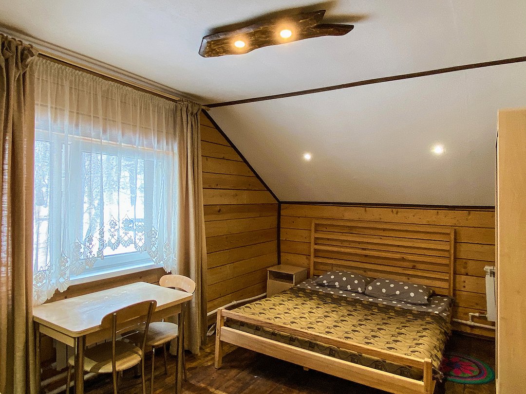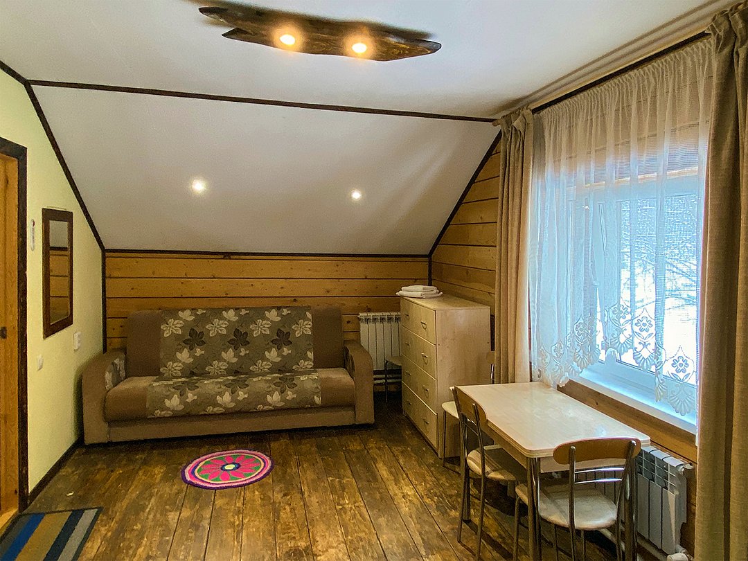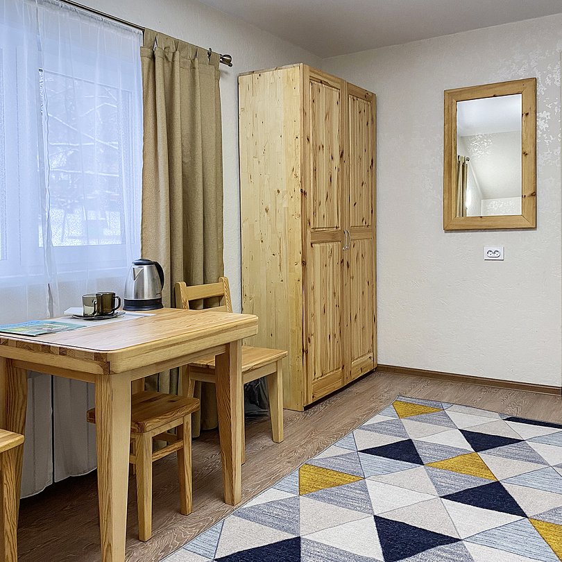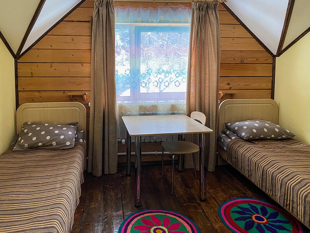 Двухкомнатный номер гостевого комплекса «Пчёлки» с собственной ванной комнатой и доступом к террасе подойдёт для спокойного семейного отдыха